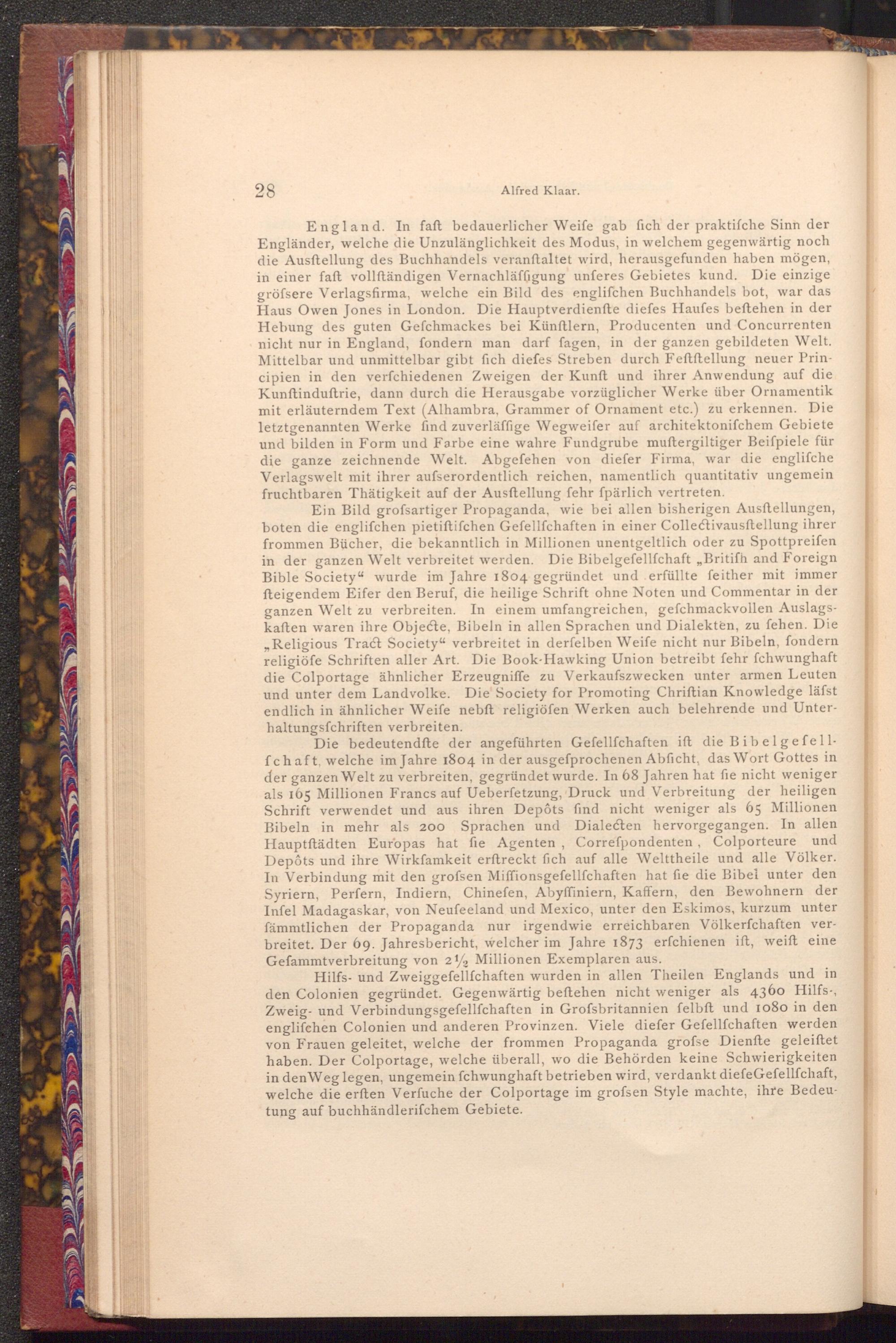 Hilfs- und Zweiggefellſchaften wurden in allen Theilen Englands und in den Colonien gegründet. Gegenwärtig beftehen nicht weniger als 4360 Hilfs-, Zweig- und Verbindungsgefellſchaften in Grofsbritannien felbft und 1080 in den englifchen Colonien und anderen Provinzen. Viele diefer Gefellfchaften werden. von Frauen geleitet, welche der frommen Propaganda grofse Dienfte geleiftet haben. Der Colportage, welche überall, wo die Behörden keine Schwierigkeiten in den Weg legen, ungemein fchwunghaft betrieben wird, verdankt diefe Gefellſchaft, welche die erften Verfuche der Colportage im grofsen Style machte, ihre Bedeutung auf buchhändlerifchem Gebiete.