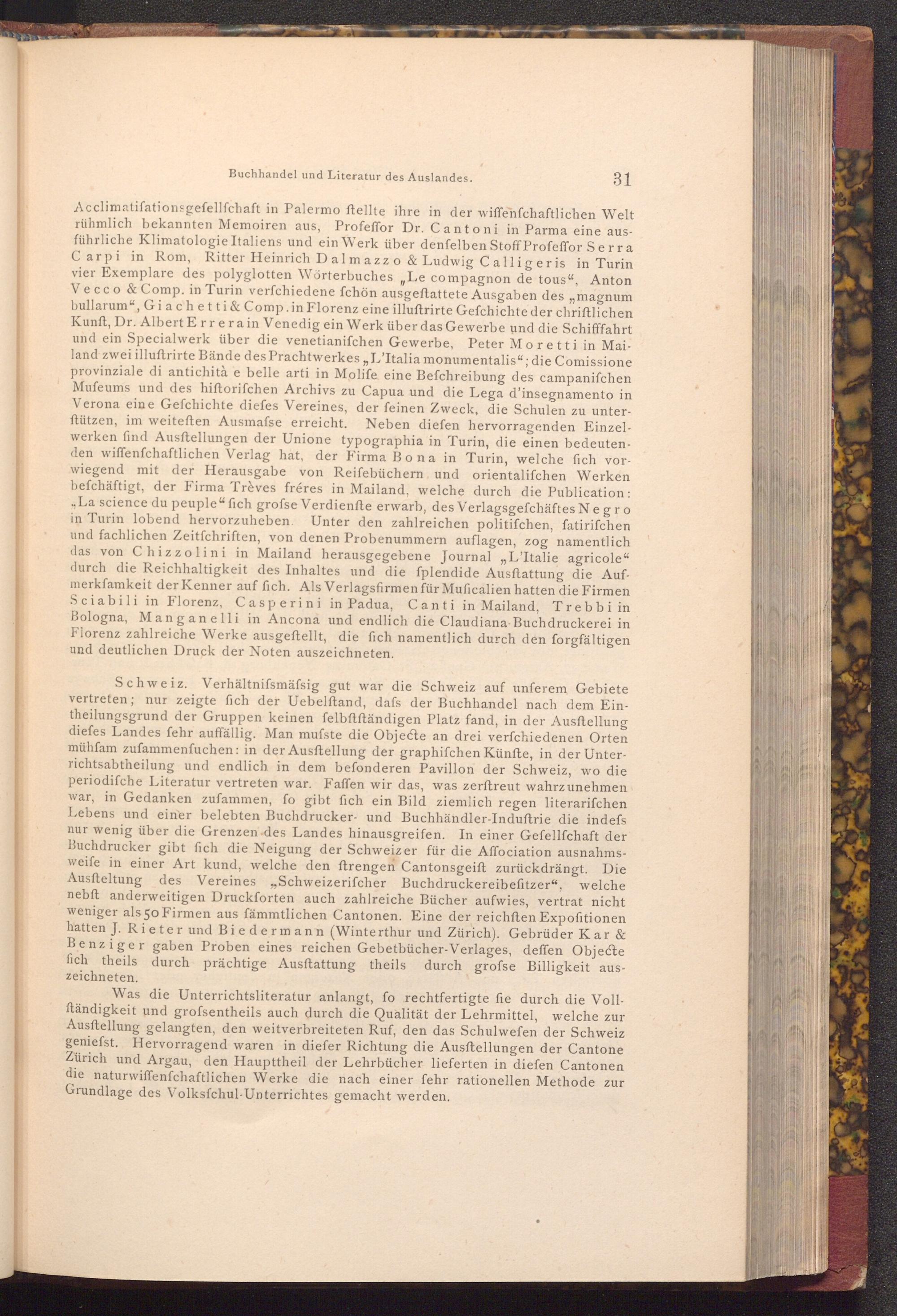 Schweiz. Verhältnifsmässig gut war die Schweiz auf unferem Gebiete vertreten; nur zeigte fich der Uebelftand, dafs der Buchhandel nach dem Eintheilungsgrund der Gruppen keinen felbftftändigen Platz fand, in der Ausftellung diefes Landes fehr auffällig. Man mufste die Objecte an drei verfchiedenen Orten mühfam zufammenfuchen: in der Ausftellung der graphifchen Künfte, in der Unterrichtsabtheilung und endlich in dem befonderen Pavillon der Schweiz, wo die periodifche Literatur vertreten war. Faffen wir das, was zerftreut wahrzunehmen war, in Gedanken zufammen, fo gibt fich ein Bild ziemlich regen literarifchen Lebens und einer belebten Buchdrucker- und Buchhändler- Induftrie die indefs nur wenig über die Grenzen des Landes hinausgreifen. In einer Gefellſchaft der Buchdrucker gibt fich die Neigung der Schweizer für die Affociation ausnahmsweife in einer Art kund, welche den ftrengen Cantonsgeift zurückdrängt. Die Ausfteltung des Vereines Schweizerifcher Buchdruckereibefitzer", welche nebft anderweitigen Druckforten auch zahlreiche Bücher aufwies, vertrat nicht weniger als 50 Firmen aus fämmtlichen Cantonen. Eine der reichften Expofitionen hatten J. Rieter und Biedermann( Winterthur und Zürich). Gebrüder Kar& Benziger gaben Proben eines reichen Gebetbücher- Verlages, deffen Objecte fich theils durch prächtige Ausftattung theils durch grofse Billigkeit aus