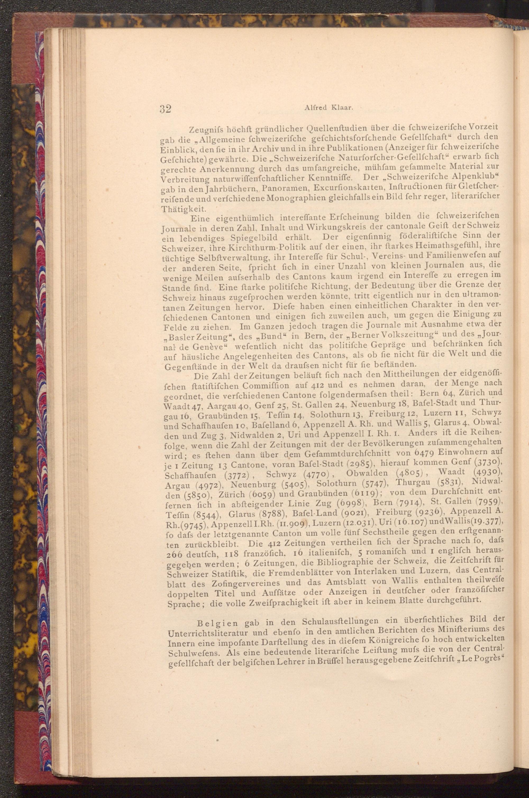 Zeugnifs höchft gründlicher Quellenftudien über die fchweizerifche Vorzeit gab die„ Allgemeine fchweizerifche gefchichtsforfchende Gefellſchaft" durch den Einblick, den fie in ihr Archiv und in ihre Publikationen( Anzeiger für fchweizerifche Gefchichte) gewährte. Die ,, Schweizerifche Naturforfcher- Gefellſchaft" erwarb fich gerechte Anerkennung durch das umfangreiche, mühfam gefammelte Material zur Verbreitung naturwiffenfchaftlicher Kenntniffe. Der Schweizerifche Alpenklub" gab in den Jahrbüchern, Panoramen, Excurfionskarten, Inftructionen für Gletscherreifende und verfchiedene Monographien gleichfalls ein Bild fehr reger, literarifcher Thätigkeit.