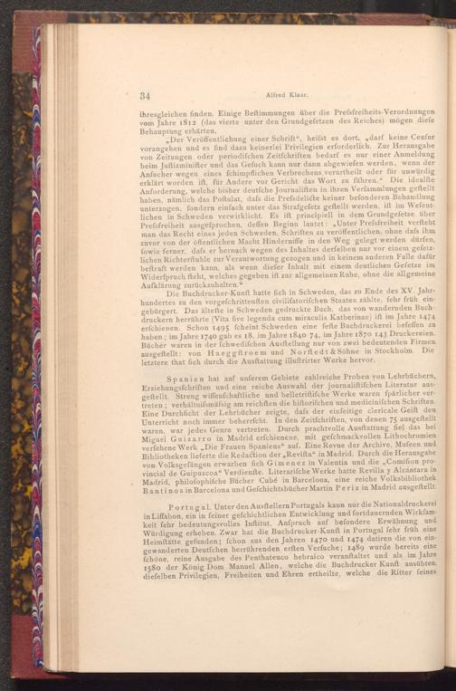 Portugal. Unter den Ausftellern Portugals kann nur die Nationaldruckerei in Liffabon, ein in feiner gefchichtlichen Entwicklung und fortdauernden Wirkfamkeit fehr bedeutungsvolles Inftitut, Anfpruch auf befondere Erwähnung und Würdigung erheben. Zwar hat die Buchdrucker- Kunft in Portugal fehr früh eine Heimftätte, gefunden; fchon aus den Jahren 1470 und 1474 datiren die von eingewanderten Deutfchen herrührenden erften Verfuche; 1489 wurde bereits eine fchöne, reine Ausgabe des Penthateuco hebraico veranſtaltet und als im Jahre 1580 der König Dom Manuel Allen, welche die Buchdrucker Kunft ausübten, diefelben Privilegien, Freiheiten und Ehren ertheilte, welche die Ritter feines