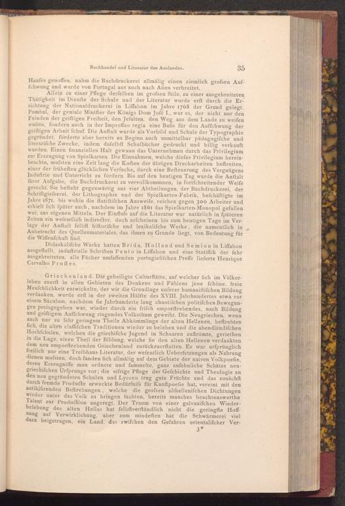 Allein zu einer Pflege derfelben im grofsen Stile, zu einer ausgebreiteten Thätigkeit im Dienfte der Schule und der Literatur wurde erft durch die Errichtung der Nationaldruckerei in Liffabon im Jahre 1768 der Grund gelegt. Pombal, der geniale Minifter des Königs Dom Jofé I., war es, der nicht nur den Feinden der geiftigen Freiheit, den Jefuiten, den Weg aus dem Lande zu weifen wufste, fondern auch in der Impreffao regia eine Bafis für den Auffchwung der geiftigen Arbeit fchuf. Die Anftalt wurde als Vorbild und Schule der Typographie gegründet, förderte aber bereits zu Beginn auch unmittelbar pädagogische und literarifche Zwecke, indem dafelbft Schulbücher gedruckt und billig verkauft wurden. Einen finanziellen Halt gewann das Unternehmen durch das Privilegium zur Erzeugung von Spielkarten. Die Einnahmen, welche diefes Privilegium hereinbrachte, mufsten eine Zeit lang die Koften der übrigen Druckarbeiten beftreiten, einer der früheften glücklichen Verfuche, durch eine Befteuerung des Vergnügens Induftrie und Unterricht zu fördern. Bis auf den heutigen Tag wurde die Anftalt ihrer Aufgabe, die Buchdruckerei zu vervollkommnen, in fortfchreitender Weife gerecht. Sie befteht gegenwärtig aus vier Abtheilungen, der Buchdruckerei, der Schriftgiefserei, der Lithographie und der Spielkarten- Fabrik, befchäftigte im Jahre 1871, bis wohin die ftatiftifchen Ausweife, reichen gegen 300 Arbeiter und erhielt fich fpäter auch, nachdem im Jahre 1861 das Spielkarten- Monopol gefallen war, aus eigenen Mitteln. Der Einfluss auf die Literatur war natürlich in fpäteren Zeiten ein wefentlich indirecter, doch erfcheinen bis zum heutigen Tage im Verlage der Anftalt felbft hiftorifche und lexikalifche Werke, die namentlich in Anbetracht des Quellenmateriales, das ihnen zu Grunde liegt, von Bedeutung für die Wiffenfchaft find.