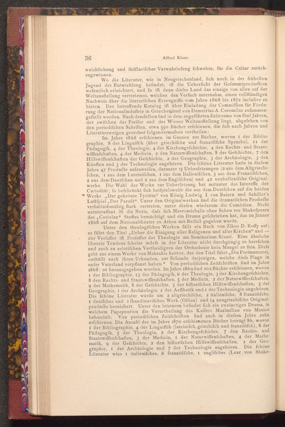 Wo die Literatur, wie in Neugriechenland, fich noch, in der früheften Jugend der Entwicklung befindet, ift die Ueberficht der Gefammtproduction wefentlich erleichtert, und fo ift denn diefes Land das einzige von allen auf der Weltausftellung vertretenen, welches den Verfuch unternahm, einen vollſtändigen Nachweis über die literarifchen Erzeugniffe vom Jahre 1868 bis 1872 inclufive zu bieten. Der betreffende Katalog ift über Einladung der Commiffion für Förderung der Nationalinduftrie in Griechenland von Demetrius A. Coromilas zufammengeftellt worden. Nach demfelben find in dem angeführten Zeitraume von fünf Jahren, der zwifchen der Parifer und der Wiener Weltausftellung liegt, abgefehen von den periodifchen Schriften, etwa 550 Bücher erſchienen, die fich nach Jahren und Literaturzweigen geordnet folgendermassen vertheilen:
