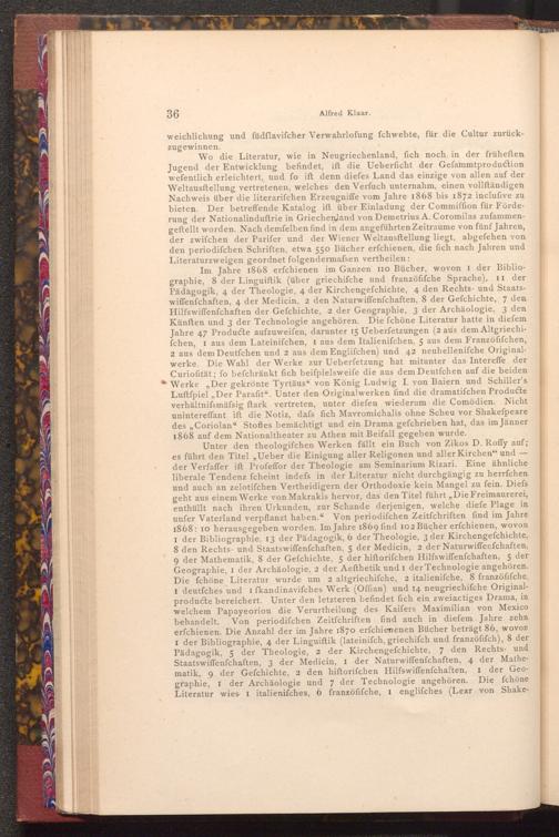 Im Jahre 1868 erfchienen im Ganzen IIO Bücher, wovon I der Bibliographie, 8 der Linguiftik( über griechifche und franzöfifche Sprache), II der Pädagogik, 4 der Theologie, 4 der Kirchengefchichte, 4 den Rechts- und Staatswiffenfchaften, 4 der Medicin, 2 den Naturwiffenfchaften, 8 der Gefchichte, 7 den Hilfswiffenfchaften der Gefchichte, 2 der Geographie, 3 der Archäologie, 3 den Künften und 3 der Technologie angehören. Die fchöne Literatur hatte in diefem Jahre 47 Producte aufzuweifen, darunter 15 Ueberfetzungen( 2 aus dem Altgriechifchen, I aus dem Lateinifchen, I aus dem Italienifchen, 5 aus dem Franzöfifchen, 2 aus dem Deutfchen und 2 aus dem Englifchen) und 42 neuhellenifche Originalwerke. Die Wahl der Werke zur Ueberfetzung hat mitunter das Intereffe der Curiofität; fo befchränkt fich beispielsweife die aus dem Deutfchen auf die beiden Werke„ Der gekrönte Tyrtäus" von König Ludwig I. von Baiern und Schiller's Luftfpiel„ Der Parafit". Unter den Originalwerken find die dramatifchen Producte verhältnifsmäfsig ftark vertreten, unter diefen wiederum die Comödien. Nicht unintereffant ift die Notiz, dafs fich Mavromichalis ohne Scheu vor Shakeſpeare des, Coriolan" Stoffes bemächtigt und ein Drama gefchrieben hat, das im Jänner 1868 auf dem Nationaltheater zu Athen mit Beifall gegeben wurde.