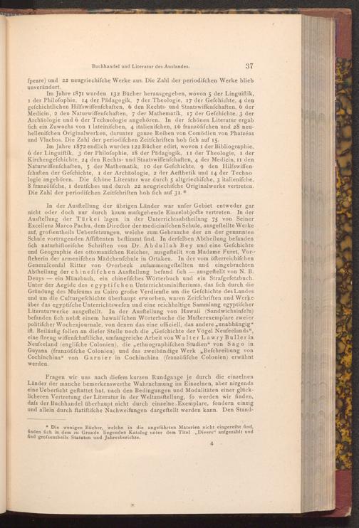 In der Ausftellung der übrigen Länder war unfer Gebiet entweder gar nicht oder doch nur durch kaum mafsgebende Einzelobjecte vertreten. In der Ausftellung der Türkei lagen in der Unterrichtsabtheilung 75 von Seiner Excellenz Marco Pachu, dem Director der medicinifchen Schule, ausgeftellte Werke auf, grofsentheils Ueberfetzungen, welche zum Gebrauche der an der genannten Schule vortragenden Affiftenten beftimmt find. In derfelben Abtheilung befanden fich naturhiftorifche Schriften von Dr. Abdullah Bey und eine Gefchichte und Geographie des ottomanifchen Reiches, ausgeftellt von Madame Furet, Vor-. fteherin der armenifchen Mädchenfchule in Ortakeu. In der vom öfterreichifchen Generalconful Ritter von Overbeck zufammengeftellten und eingebrachten Abtheilung der chinefifchen Ausftellung befand fich ausgeftellt von N. B. Denys ein Münzbuch, ein chinefifches Wörterbuch und ein Strafgefetzbuch. Unter der Aegide des egyptifchen Unterrichtsminifteriums, das fich durch die Gründung des Muſeums zu Cairo grofse Verdienfte um die Gefchichte des Landes und um die Culturgefchichte überhaupt erworben, waren Zeitfchriften und Werke über das egyptifche Unterrichtswefen und eine reichhaltige Sammlung egyptifcher Literaturwerke ausgeftellt. In der Ausftellung von Hawaii( Sandwichsinfeln) befanden fich nebft einem hawaii'fchen Wörterbuche die Mufterexemplare zweier politifcher Wochenjournale, von denen das eine officiell, das andere ,, unabhängig" ift. Beiläufig follen an diefer Stelle noch die„ Gefchichte der Vögel Neufeelands", eine ftreng wiffenfchaftliche, umfangreiche Arbeit von Walter Lawry Buller in Neufeeland( englifche Colonien), die, ethnographifchen Studien" von Sago in Guyana( franzöfifche Colonien) und das zweibändige Werk„ Befchreibung von Cochinchina" von Garnier in Cochinchina( franzöfifche Colonien) erwähnt