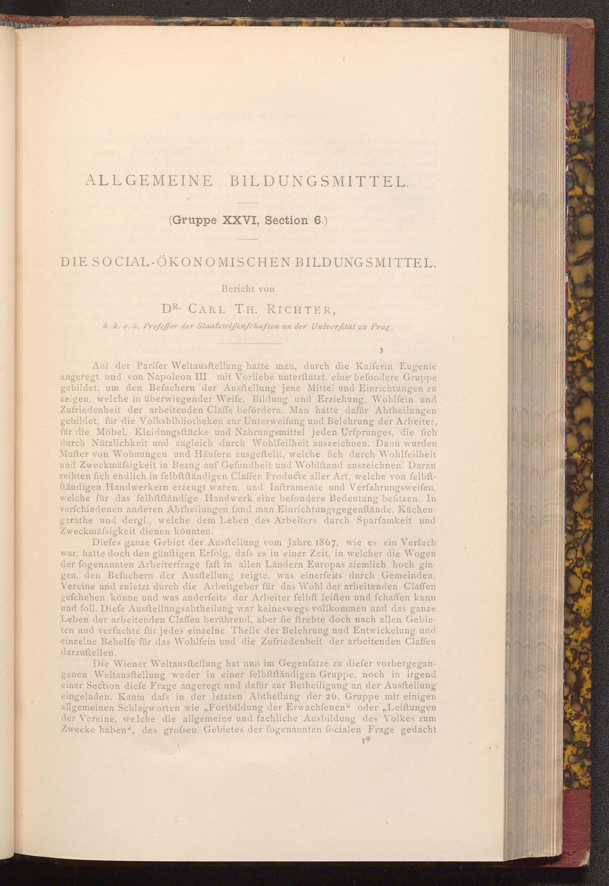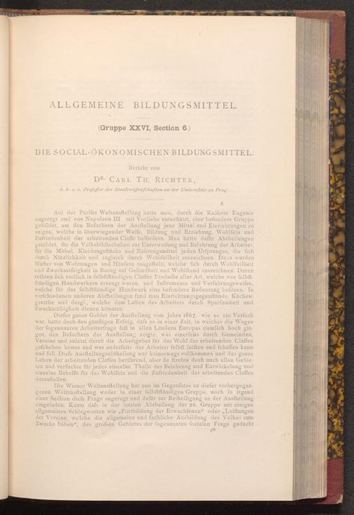 Die Wiener Weltausftellung hat nun im Gegenfatze zu diefer vorhergegangenen Weltausftellung weder in einer felbftftändigen Gruppe, noch in irgend einer Section diefe Frage angeregt und dafür zur Betheiligung an der Ausftellung eingeladen. Kaum dafs in der letzten Abtheilung der 26. Gruppe mit einigen allgemeinen Schlagworten wie„ Fortbildung der Erwachſenen" oder„, Leiftungen der Vereine, welche die allgemeine und fachliche Ausbildung des Volkes zum Zwecke haben", des grofsen Gebietes der fogenannten focialen Frage gedacht