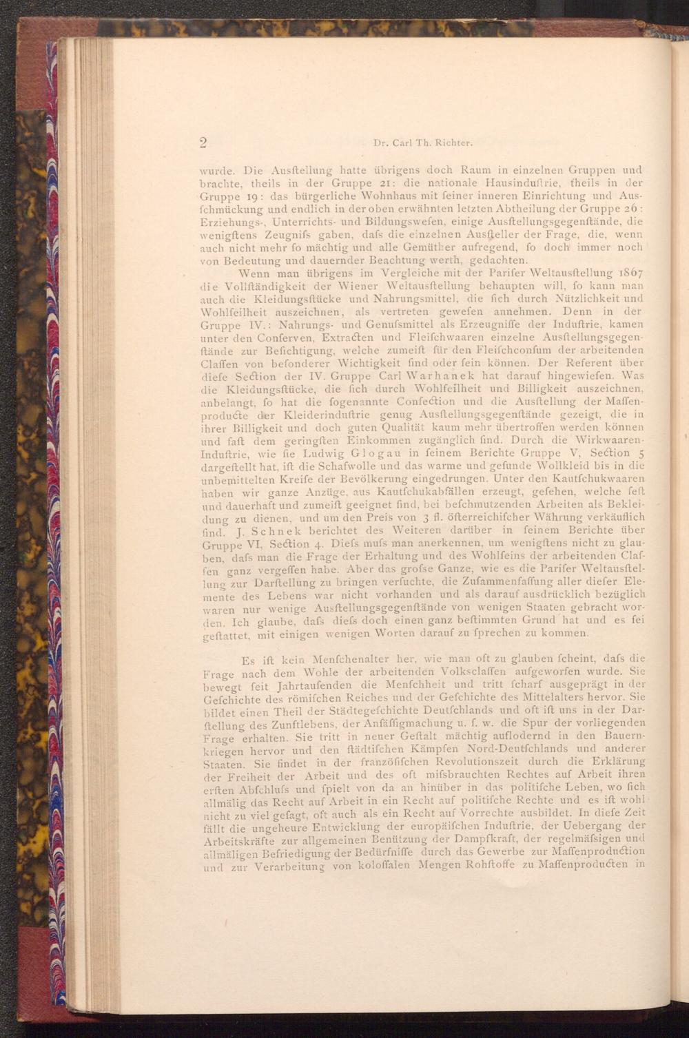 Wenn man übrigens im Vergleiche mit der Parifer Weltausftellung 1867 die Vollständigkeit der Wiener Weltausftellung behaupten will, fo kann man auch die Kleidungsftücke und Nahrungsmittel, die fich durch Nützlichkeit und Wohlfeilheit auszeichnen, als vertreten gewefen annehmen. Denn in der Gruppe IV. Nahrungs- und Genufsmittel als Erzeugniffe der Induftrie, kamen unter den Conferven, Extracten und Fleifchwaaren einzelne Ausftellungsgegenftände zur Befichtigung, welche zumeift für den Fleifchconfum der arbeitenden Claffen von befonderer Wichtigkeit find oder fein können. Der Referent über diefe Section der IV. Gruppe Carl Warhanek hat darauf hingewiefen. Was die Kleidungsftücke, die fich durch Wohlfeilheit und Billigkeit auszeichnen, anbelangt, fo hat die fogenannte Confection und die Ausstellung der Maffenproducte der Kleiderinduftrie genug Ausftellungsgegenstände gezeigt, die in ihrer Billigkeit und doch guten Qualität kaum mehr übertroffen werden können und faft dem geringften Einkommen zugänglich find. Durch die WirkwaarenInduftrie, wie fie Ludwig Glogau in feinem Berichte Gruppe V, Section 5 dargestellt hat, ift die Schafwolle und das warme und gefunde Wollkleid bis in die unbemittelten Kreife der Bevölkerung eingedrungen. Unter den Kautfchukwaaren haben wir ganze Anzüge, aus Kautfchukabfällen erzeugt, gefehen, welche feft und dauerhaft und zumeift geeignet find, bei befchmutzenden Arbeiten als Bekleidung zu dienen, und um den Preis von 3 fl. öfterreichifcher Währung verkäuflich find. J. Schnek berichtet des Weiteren darüber in feinem Berichte über Gruppe VI, Section 4. Diefs mufs man anerkennen, um wenigftens nicht zu glauben, dafs man die Frage der Erhaltung und des Wohlfeins der arbeitenden Claffen ganz vergeffen habe. Aber das grofse Ganze, wie es die Parifer Weltausftellung zur Darstellung zu bringen verfuchte, die Zuſammenfaffung aller diefer Elemente des Lebens war nicht vorhanden und als darauf ausdrücklich bezüglich waren nur wenige Ausftellungsgegenstände von wenigen Staaten gebracht worden. Ich glaube, dafs diefs doch einen ganz beftimmten Grund hat und es fei geftattet, mit einigen wenigen Worten darauf zu fprechen zu kommen.