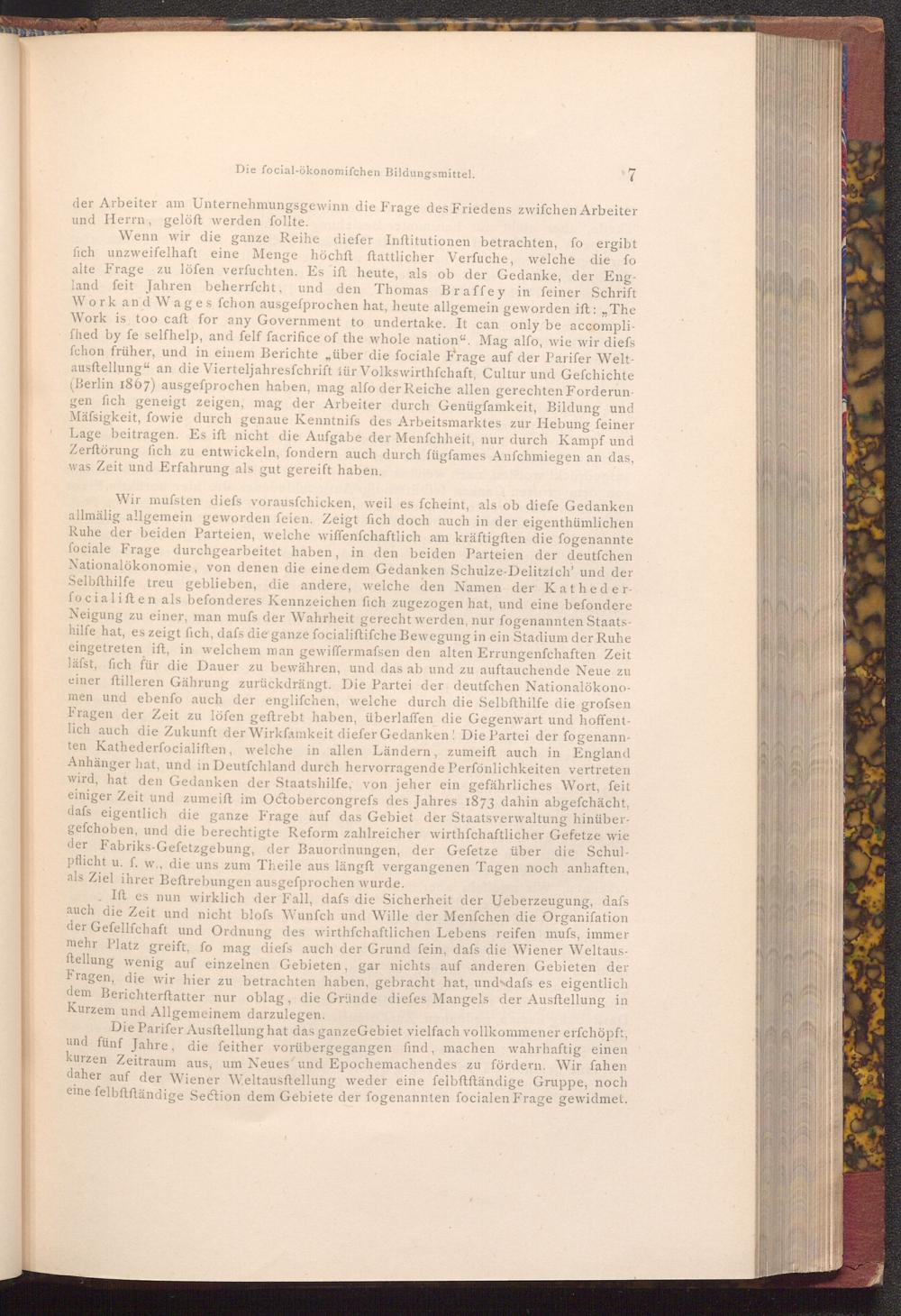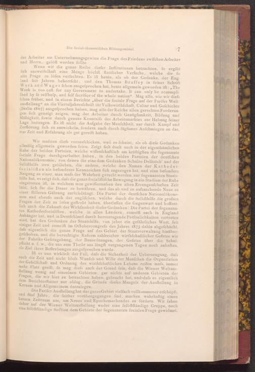 Ift es nun wirklich der Fall, dafs die Sicherheit der Ueberzeugung, dafs auch die Zeit und nicht blofs Wunfch und Wille der Menfchen die Organiſation der Gefellſchaft und Ordnung des wirthschaftlichen Lebens reifen mufs, immer mehr Platz greift, fo mag diefs auch der Grund fein, dafs die Wiener Weltausftellung wenig auf einzelnen Gebieten, gar nichts auf anderen Gebieten der Fragen, die wir hier zu betrachten haben, gebracht hat, und dafs es eigentlich dem Berichterftatter nur oblag, die Gründe diefes Mangels der Ausftellung in Kurzem und Allgemeinem darzulegen.