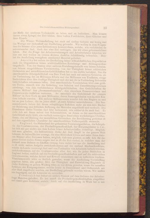 England, das Mutterland der gefammten Vereinsorganifation, die Schöpferin der Confumvereine, der Productivgenoffenfchaft, der Einigungsämter u. f. w., hat fich mit gar nichts aus dem Leben feiner Arbeiterclaffen betheiligt. Möglich, dafs man glaubte, die Inftitutionen diefer Art find längft in der ganzen Welt bekannt, fie haben Bücher erzeugt, die eine Bibliothek bilden und unter ihren Autoren Männer aller Nationen haben, möglich, dafs man glaubte, es laffe fich für das ganze Gebiet nichts Neues zeigen und es ift die Zeit vorbei, in welcher man der Zukunft neue Bahnen zu fchaffen vermag, kurz nichts bot uns die Ausftellung und es ift nicht unfere Aufgabe zurückzukommen auf die taufend Mechanikinftitute, welche im Lande verzweigt find und von Taufenden von Arbeitern befucht werden, zurückzukommen auf die Confumvereine aller Art, wie fie jedes Städtchen in England befitzt, endlich auf die Productivgenoffenfchaften und auf die zahlreichen Gewerkvereine, welche Arbeit und Erwerb erleichtern und zu befördern trachten. Wünschenswerth wäre es freilich gewefen, wenn die Ausftellung Veranlaffung gegeben hätte, ein grofses Bild der Thätigkeit und Entwicklung Englands in diefer Richtung zu geben. Wichtig wäre es vor Allem gewefen, wenn die neueften Refultate der Einigungsämter, welche heute in Deutfchland und Oefterreich mit aller Haft angeftrebt werden, zur Darstellung gebracht worden wären. Wir müffen uns begnügen, auf die Literatur zu verweifen.
