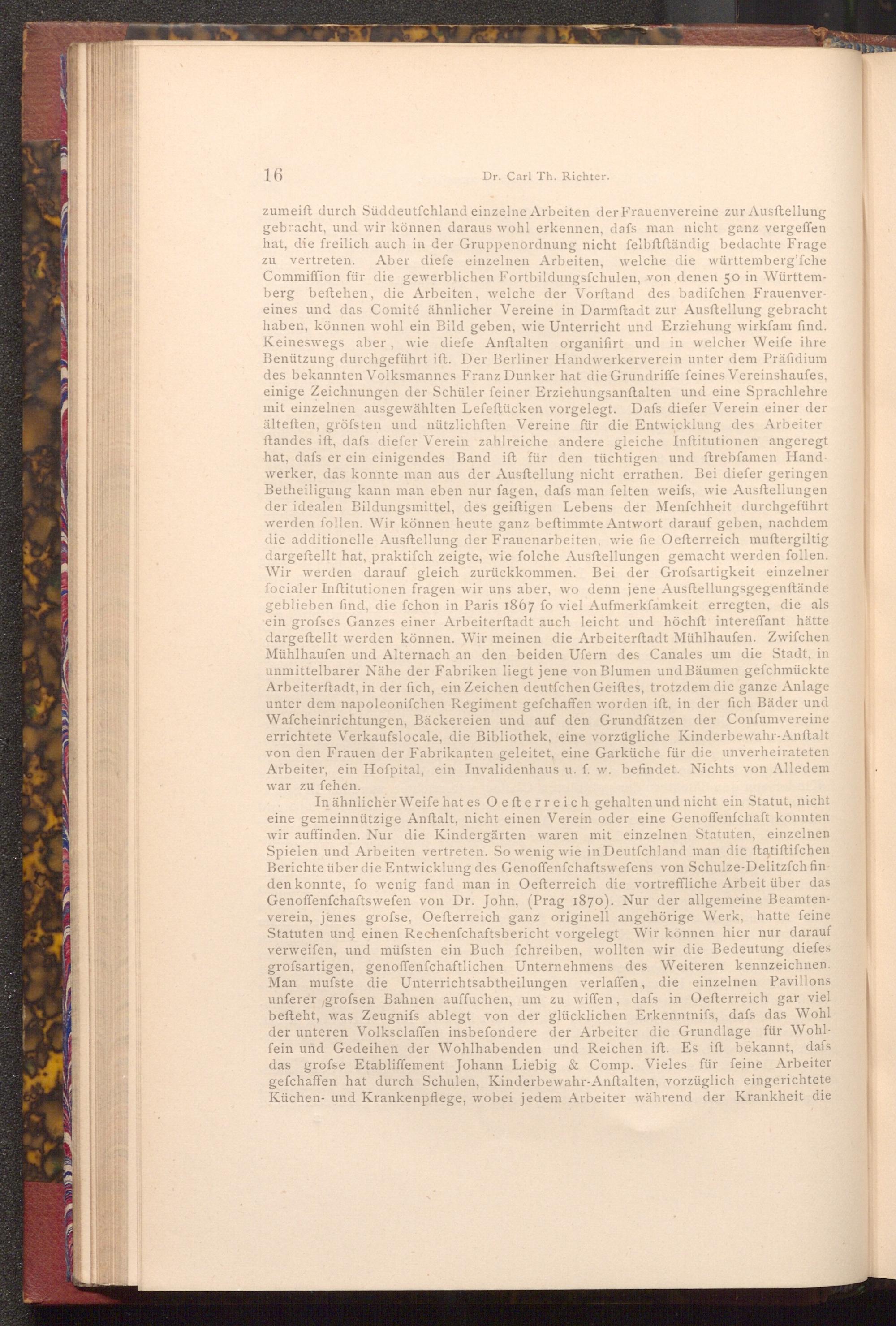 In ähnlicher Weife hat es O efterreich gehalten und nicht ein Statut, nicht eine gemeinnützige Anftalt, nicht einen Verein oder eine Genoffenfchaft konnten wir auffinden. Nur die Kindergärten waren mit einzelnen Statuten, einzelnen Spielen und Arbeiten vertreten. So wenig wie in Deutfchland man die ftatiftifchen Berichte über die Entwicklung des Genoffenfchaftswefens von Schulze- Delitzsch finden konnte, fo wenig fand man in Oefterreich die vortreffliche Arbeit über das Genoffenfchaftswefen von Dr. John,( Prag 1870). Nur der allgemeine Beamtenverein, jenes grofse, Oefterreich ganz originell angehörige Werk, hatte feine Statuten und einen Rechenfchaftsbericht vorgelegt Wir können hier nur darauf verweifen, und müfsten ein Buch fchreiben, wollten wir die Bedeutung diefes grofsartigen, genoffenfchaftlichen Unternehmens des Weiteren kennzeichnen. Man musste die Unterrichtsabtheilungen verlaffen, die einzelnen Pavillons unferer grofsen Bahnen auffuchen, um zu wiffen, dafs in Oefterreich gar viel befteht, was Zeugnifs ablegt von der glücklichen Erkenntnifs, dafs das Wohl der unteren Volksclaffen insbefondere der Arbeiter die Grundlage für Wohlfein und Gedeihen der Wohlhabenden und Reichen ift. Es ift bekannt, dafs das grofse Etabliffement Johann Liebig& Comp. Vieles für feine Arbeiter gefchaffen hat durch Schulen, Kinderbewahr- Anftalten, vorzüglich eingerichtete Küchen- und Krankenpflege, wobei jedem Arbeiter während der Krankheit die