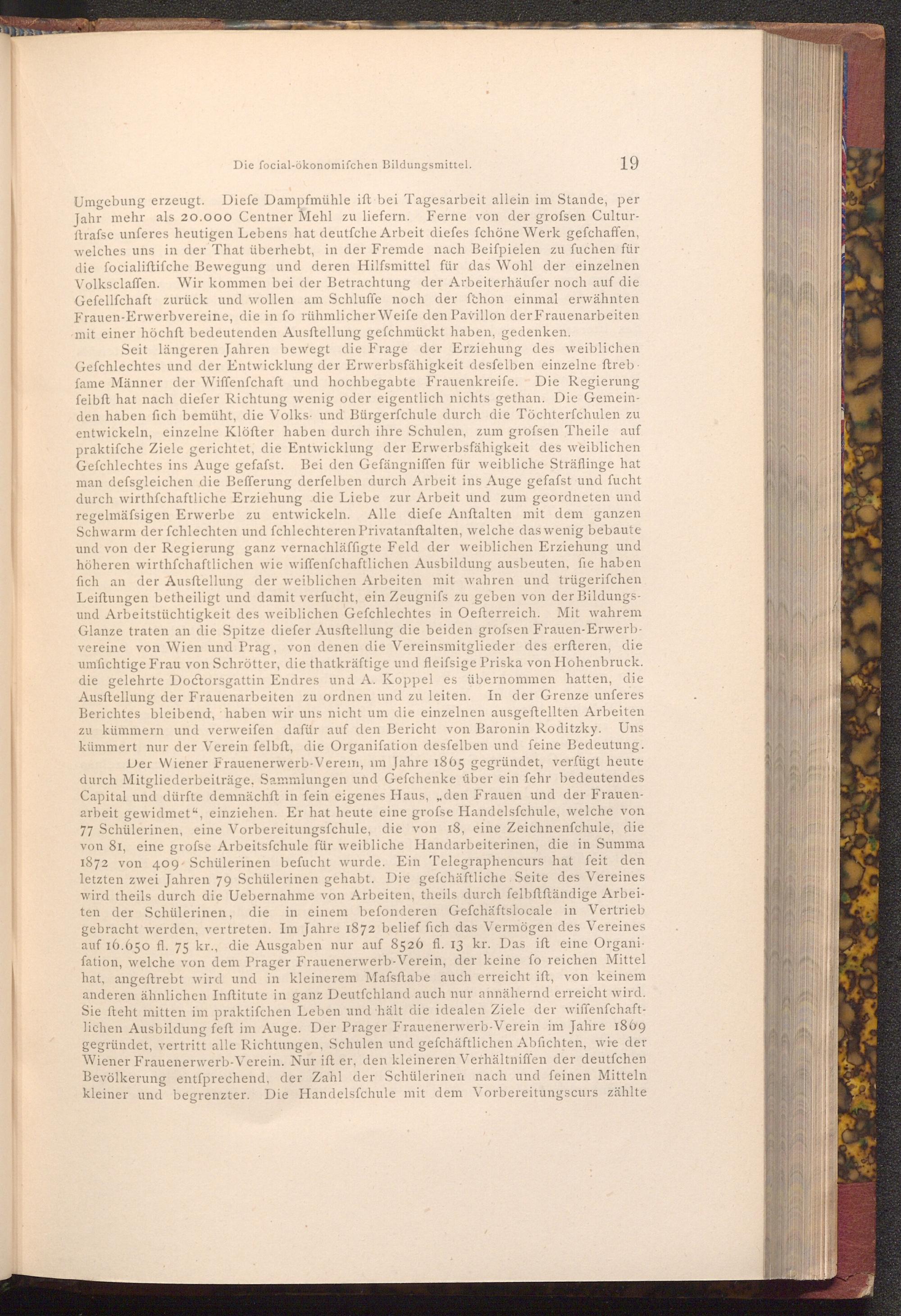 Seit längeren Jahren bewegt die Frage der Erziehung des weiblichen Gefchlechtes und der Entwicklung der Erwerbsfähigkeit desfelben einzelne ftreb fame Männer der Wiffenfchaft und hochbegabte Frauenkreife. Die Regierung felbft hat nach diefer Richtung wenig oder eigentlich nichts gethan. Die Gemeinden haben fich bemüht, die Volks und Bürgerfchule durch die Töchterfchulen zu entwickeln, einzelne Klöfter haben durch ihre Schulen, zum grofsen Theile auf praktifche Ziele gerichtet, die Entwicklung der Erwerbsfähigkeit des weiblichen Gefchlechtes ins Auge gefafst. Bei den Gefängniffen für weibliche Sträflinge hat man defsgleichen die Befferung derfelben durch Arbeit ins Auge gefafst und fucht durch wirthschaftliche Erziehung die Liebe zur Arbeit und zum geordneten und regelmässigen Erwerbe zu entwickeln. Alle diefe Anftalten mit dem ganzen Schwarm der fchlechten und fchlechteren Privatanftalten, welche das wenig bebaute und von der Regierung ganz vernachläffigte Feld der weiblichen Erziehung und höheren wirthschaftlichen wie wiffenfchaftlichen Ausbildung ausbeuten, fie haben fich an der Ausftellung der weiblichen Arbeiten mit wahren und trügerifchen Leiftungen betheiligt und damit verfucht, ein Zeugnifs zu geben von der Bildungsund Arbeitstüchtigkeit des weiblichen Gefchlechtes in Oefterreich. Mit wahrem Glanze traten an die Spitze diefer Ausftellung die beiden grofsen Frauen- Erwerbvereine von Wien und Prag, von denen die Vereinsmitglieder des erfteren, die umfichtige Frau von Schrötter, die thatkräftige und fleifsige Priska von Hohenbruck. die gelehrte Doctorsgattin Endres und A. Koppel es übernommen hatten, die Ausftellung der Frauenarbeiten zu ordnen und zu leiten. In der Grenze unferes Berichtes bleibend, haben wir uns nicht um die einzelnen ausgestellten Arbeiten zu kümmern und verweifen dafür auf den Bericht von Baronin Roditzky. Uns kümmert nur der Verein felbft, die Organiſation desfelben und feine Bedeutung. Der Wiener Frauenerwerb- Verem, im Jahre 1865 gegründet, verfügt heute durch Mitgliederbeiträge, Sammlungen und Gefchenke über ein fehr bedeutendes Capital und dürfte demnächft in fein eigenes Haus,„ den Frauen und der Frauenarbeit gewidmet", einziehen. Er hat heute eine grofse Handelsfchule, welche von 77 Schülerinen, eine Vorbereitungsfchule, die von 18, eine Zeichnenfchule, die von 81, eine grofse Arbeitsfchule für weibliche Handarbeiterinen, die in Summa 1872 von 409 Schülerinen befucht wurde. Ein Telegraphencurs hat feit den letzten zwei Jahren 79 Schülerinen gehabt. Die gefchäftliche Seite des Vereines wird theils durch die Uebernahme von Arbeiten, theils durch felbftftändige Arbeiten der Schülerinen, die in einem befonderen Gefchäftslocale in Vertrieb gebracht werden, vertreten. Im Jahre 1872 belief fich das Vermögen des Vereines auf 16.650 fl. 75 kr., die Ausgaben nur auf 8526 fl. 13 kr. Das iſt eine Organi fation, welche von dem Prager Frauenerwerb- Verein, der keine fo reichen Mittel hat, angeftrebt wird und in kleinerem Mafsftabe auch erreicht ift, von keinem anderen ähnlichen Inftitute in ganz Deutfchland auch nur annähernd erreicht wird. Sie fteht mitten im praktifchen Leben und hält die idealen Ziele der wiffenfchaftlichen Ausbildung feft im Auge. Der Prager Frauenerwerb- Verein im Jahre 1869 gegründet, vertritt alle Richtungen, Schulen und gefchäftlichen Abfichten, wie der Wiener Frauenerwerb- Verein. Nur ift er, den kleineren Verhältniffen der deutfchen Bevölkerung entsprechend, der Zahl der Schülerinen nach und feinen Mitteln kleiner und begrenzter. Die Handelsfchule mit dem Vorbereitungscurs zählte