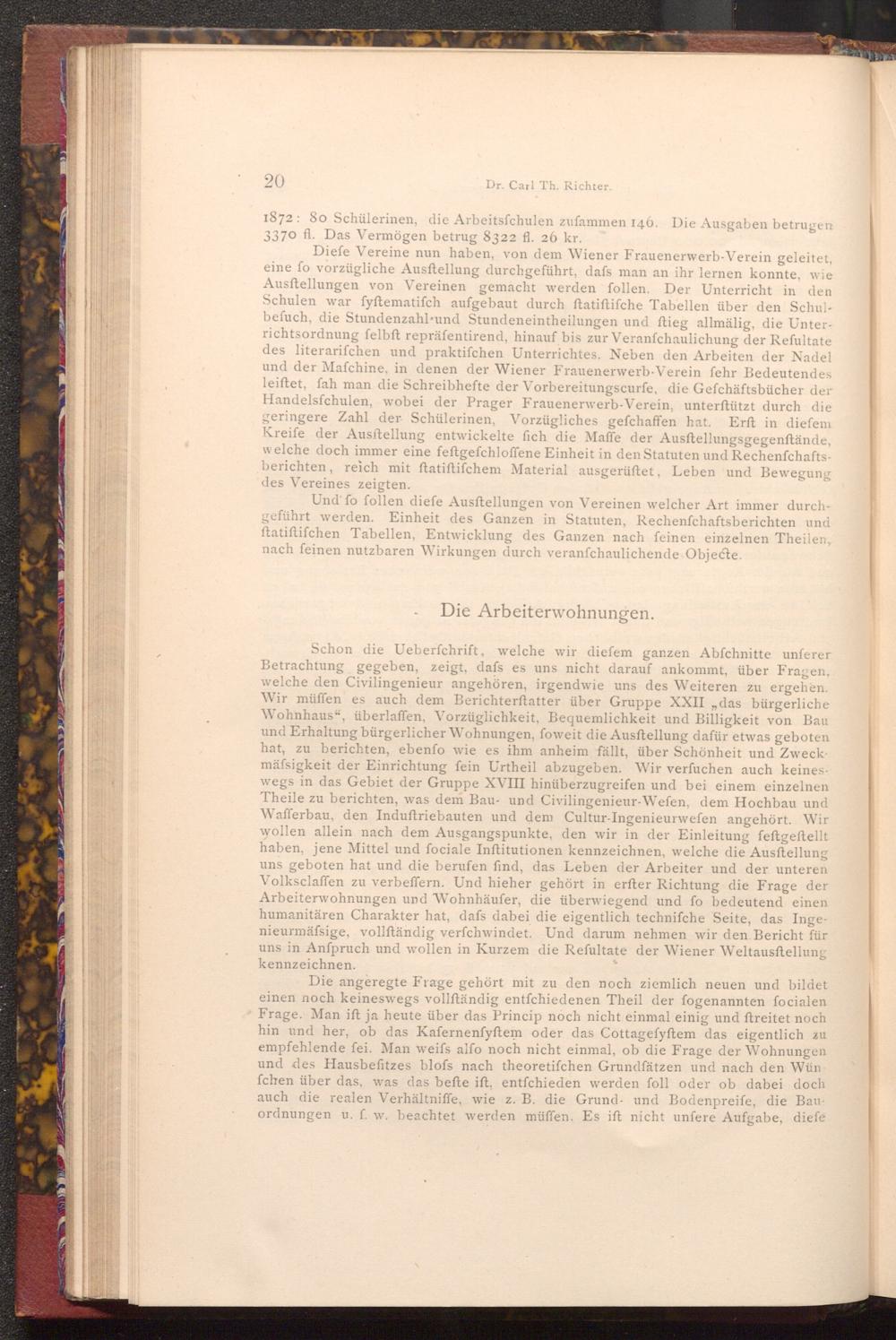 Schon die Ueberfchrift, welche wir diefem ganzen Abfchnitte unferer Betrachtung gegeben, zeigt, dafs es uns nicht darauf ankommt, über Fragen, welche den Civilingenieur angehören, irgendwie uns des Weiteren zu ergehen. Wir müffen es auch dem Berichterstatter über Gruppe XXII ,, das bürgerliche Wohnhaus", überlaffen, Vorzüglichkeit, Bequemlichkeit und Billigkeit von Bau und Erhaltung bürgerlicher Wohnungen, foweit die Ausftellung dafür etwas geboten hat, zu berichten, ebenfo wie es ihm anheim fällt, über Schönheit und Zweckmässigkeit der Einrichtung fein Urtheil abzugeben. Wir verfuchen auch keineswegs in das Gebiet der Gruppe XVIII hinüberzugreifen und bei einem einzelnen Theile zu berichten, was dem Bau- und Civilingenieur- Wefen, dem Hochbau und Wafferbau, den Induftriebauten und dem Cultur- Ingenieurwefen angehört. Wir wollen allein nach dem Ausgangspunkte, den wir in der Einleitung feſtgeſtellt haben, jene Mittel und fociale Inftitutionen kennzeichnen, welche die Ausstellung uns geboten hat und die berufen find, das Leben der Arbeiter und der unteren Volksclaffen zu verbeffern. Und hieher gehört in erfter Richtung die Frage der Arbeiterwohnungen und Wohnhäufer, die überwiegend und fo bedeutend einen humanitären Charakter hat, dafs dabei die eigentlich technifche Seite, das Ingenieurmäfsige, vollſtändig verfchwindet. Und darum nehmen wir den Bericht für uns in Anspruch und wollen in Kurzem die Refultate der Wiener Weltausstellung kennzeichnen.