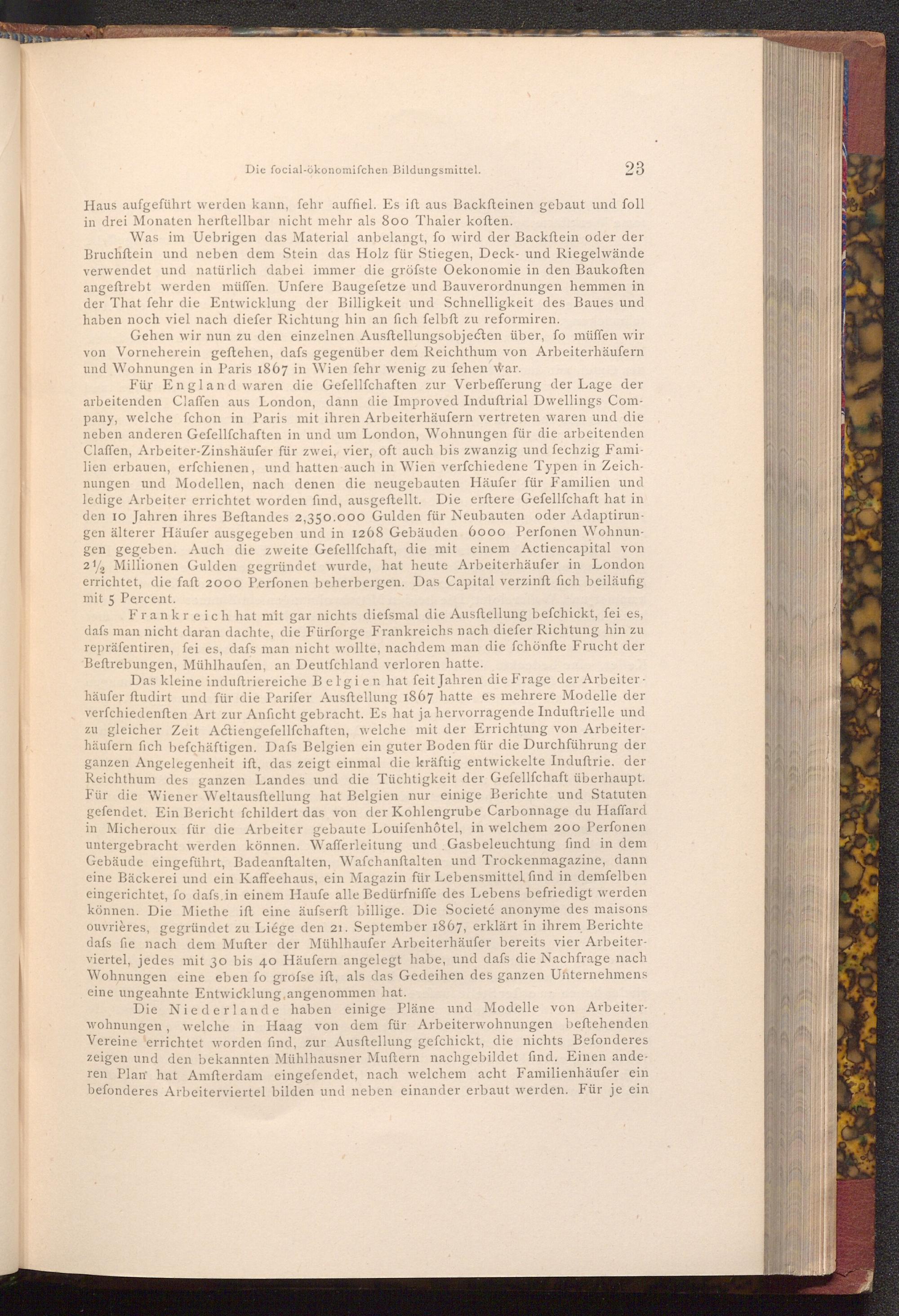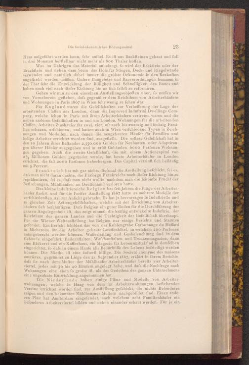 Für England waren die Gefellſchaften zur Verbefferung der Lage der arbeitenden Claffen aus London, dann die Improved Induftrial Dwellings Company, welche fchon in Paris mit ihren Arbeiterhäufern vertreten waren und die neben anderen Gefellſchaften in und um London, Wohnungen für die arbeitenden Claffen, Arbeiter- Zinshäufer für zwei, vier, oft auch bis zwanzig und fechzig Familien erbauen, erfchienen, und hatten auch in Wien verfchiedene Typen in Zeichnungen und Modellen, nach denen die neugebauten Häufer für Familien und ledige Arbeiter errichtet worden find, ausgeftellt. Die erftere Gefellſchaft hat in den 10 Jahren ihres Beftandes 2,350.000 Gulden für Neubauten oder Adaptirungen älterer Häufer ausgegeben und in 1268 Gebäuden 6000 Perfonen Wohnungen gegeben. Auch die zweite Gefellfchaft, die mit einem Actiencapital von 21 Millionen Gulden gegründet wurde, hat heute Arbeiterhäufer in London errichtet, die faft 2000 Perfonen beherbergen. Das Capital verzinft fich beiläufig mit 5 Percent.
