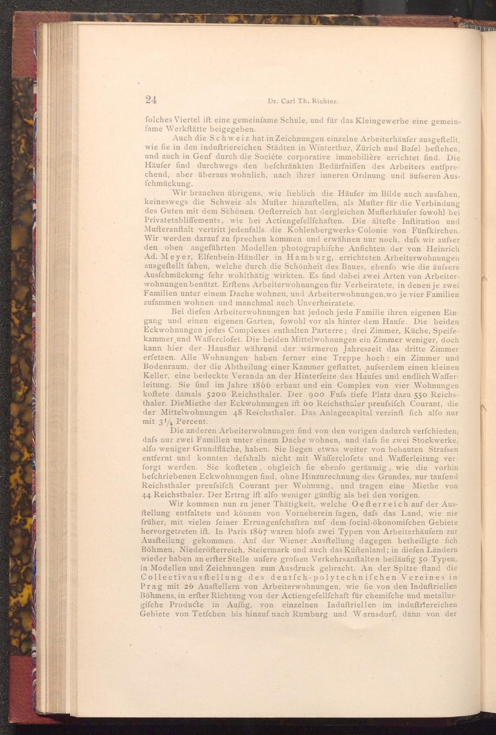 Wir brauchen übrigens, wie lieblich die Häufer im Bilde auch ausfahen, keineswegs die Schweiz als Mufter hinzuftellen, als Mufter für die Verbindung des Guten mit dem Schönen. Oefterreich hat dergleichen Mufterhäufer fowohl bei Privatetabliffements, wie bei Actiengeſellſchaften. Die ältefte Inftitution und Mufteranſtalt vertritt jedenfalls die Kohlenbergwerks Colonie von Fünfkirchen. Wir werden darauf zu fprechen kommen und erwähnen nur noch, dafs wir aufser den oben angeführten Modellen photographifche Anfichten der von Heinrich Ad. Meyer, Elfenbein- Händler in Hamburg, errichteten Arbeiterwohnungen ausgeftellt fahen, welche durch die Schönheit des Baues, ebenfo wie die äufsere Ausfchmückung fehr wohlthätig wirkten. Es find dabei zwei Arten von Arbeiterwohnungen benützt. Erftens Arbeiterwohnungen für Verheiratete, in denen je zwei Familien unter einem Dache wohnen, und Arbeiterwohnungen, wo je vier Familien zufammen wohnen und manchmal auch Unverheiratete.