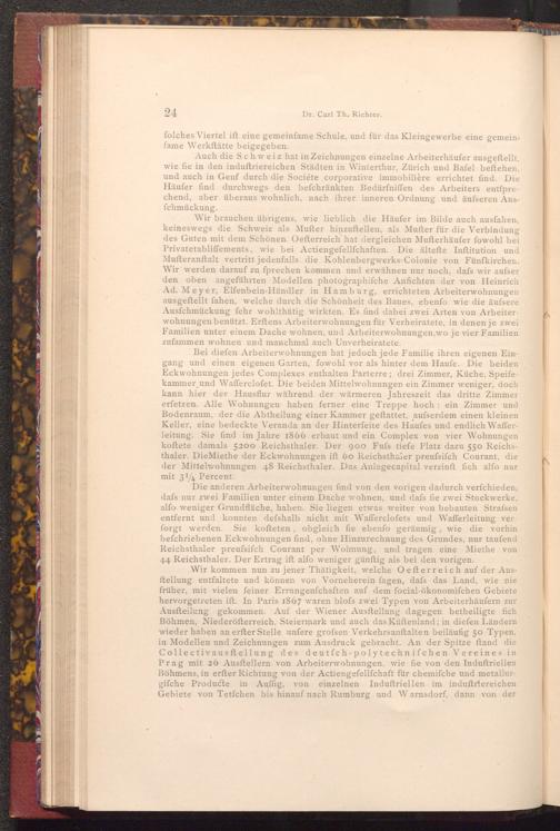 Wir kommen nun zu jener Thätigkeit, welche Oefterreich auf der Ausftellung entfaltete und können von Vorneherein fagen, dafs das Land, wie nie früher, mit vielen feiner Errungenfchaften auf dem focial- ökonomifchen Gebiete hervorgetreten ift. In Paris 1867 waren blofs zwei Typen von Arbeiterhäufern zur Ausftellung gekommen. Auf der Wiener Ausftellung dagegen betheiligte fich Böhmen, Niederöfterreich, Steiermark und auch das Küftenland; in diefen Ländern wieder haben an erfter Stelle unfere grofsen Verkehrsanftalten beiläufig 50 Typen, in Modellen und Zeichnungen zum Ausdruck gebracht. An der Spitze ftand die Collectivaus ftellung des deutfch- polytechnifchen Vereines in Prag mit 26 Ausftellern von Arbeiterwohnungen, wie fie von den Induftriellen Böhmens, in erfter Richtung von der Actiengeſellſchaft für chemifche und metallurgifche Producte in Auffig, von einzelnen Induftriellen im induftriereichen Gebiete von Tetfchen bis hinauf nach Rumburg und W arnsdorf, dann von der