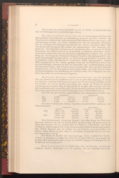 Die Triefter Handels- und Gewerbekammer hat ihre Ausweife über den Handel und die Schifffahrt von Trieft im Jahre 1871 aufgelegt, aus denen vor allem der erfeuliche Auffchwug fich ergibt, den der Seeverkehr feit 1865, fowohl bei der Ein- als bei der Ausfuhr genommen hat, indem der Werth der erfteren von 76,244.434 im Jahre 1865 auf 156.330.182 fl. im Jahre 1871 und jener der Ausfuhr beziehungsweife von 95,825.430 fl. auf 110,472.113 fl. geftiegen ift. Die Zunahme tritt jedoch grofsentheils in beiden Richtungen beim Tranfitverkehr hervor. Die Zahl der mit Ladung angekommenen und abgegangenen Schiffe war: abgegangen