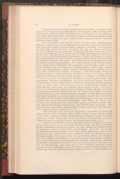 Der Viehft and war nach der letzten im Jahre 1870 vorgenommenen Zählung: 2,158.800 Pferde, 3300 Maulthiere, 30.400 Efel, 5,279.900 Stück Hornvieh, 15,077.000 Schafe, 573.000 Ziegen, 4,443.300 Schweine. Im Vergleiche zum Jahre 1857 hat fich die Zahl der Pferde um 3%, der Schafe und Ziegen um 33% vermehrt; das Hornvieh aber um 6%, und das Borftenvieh um 1% vermindert. Die Verminderung des Hornviehes ift theils dem Umftande zuzufchreiben, dafs durch die Theifsregulirung Millionen Joche Wiefen und Weiden in Ackerfelder umgewandelt und der Viehzucht entzogen wurden, theils ift fie eine Folge der häufig herrfchenden Rinderpeft. Die Pferdezucht hat in neuefter Zeit einen erfreulichen Auffchwung genommen. Die Pferde wurden durch Vollblut- Araber, fowie durch Vollblut- Engländer und normanifche Zuchthengfte, welche in den Staatsbefchälftationen dem Züchter zur Verfügung ftehen, immer mehr veredelt. In den drei Staatsgeftüten in Kisber, Babolna und Mezőhegyes befanden fich im Jahre 1872: 2874 Pferde, darunter 74 Hengfte. Ausserdem ftanden in den vier Befchälftationen in Stuhlweifsenburg, Nagy- Körös, Sepsi, Szt. György( Siebenbürgen) und Warasdin( Kroatien) 1629 Hengfte zur Verfügung der Züchter. Der Fifchft and hatte in den ungarifchen Gewäffern in Folge der grofsartigen Flufsregulirungen bedeutend abgenommen; die Zucht beginnt fich jedoch, dank der Unterſtützung, welche die Regierung den künftlichen Fifchzucht- Anftalten gewährt, wieder zu heben. Die Seidenraupen- Zucht ift faft überall verbreitet und bietet jährlich einen Ertrag von ungefähr 8000 Centner Cocons. Die Weinproduction ſchwankt zwifchen 24 und 40 Millionen Eimer jährlich; allein trotz der anerkannten Güte der Weine wird nur ein kleiner Theil( 1868-70 jährlich im Durchfchnitte 12 bis 2 Millionen Eimer, ausgeführt, weil die Weinmanipulation nicht den Standpunkt der concurrirenden Weinländer erreicht hat. Der Handel mit frischem O b ft wurde im Jahre 1871 durch eine Einfuhr von 54.623 und eine Ausfuhr von 110.513 Centner bewerkstelliget. Der Werth der BergwerkProduction war im Jahre 1871: 19,646.511 fl. gegen 14,718.814 fl. im Jahre 1867. Den bedeutendften Ertrag boten im Jahre 1871 Frifch- Roheifen 6,393.230, Gufseifen 1,671.330, Braunkohle 3,218.934, Schwarzkohlen 2,763.895, Gold 1,879.406, Silber 1,811.469 Kupfer 1,070.777 fl. u. f. w.