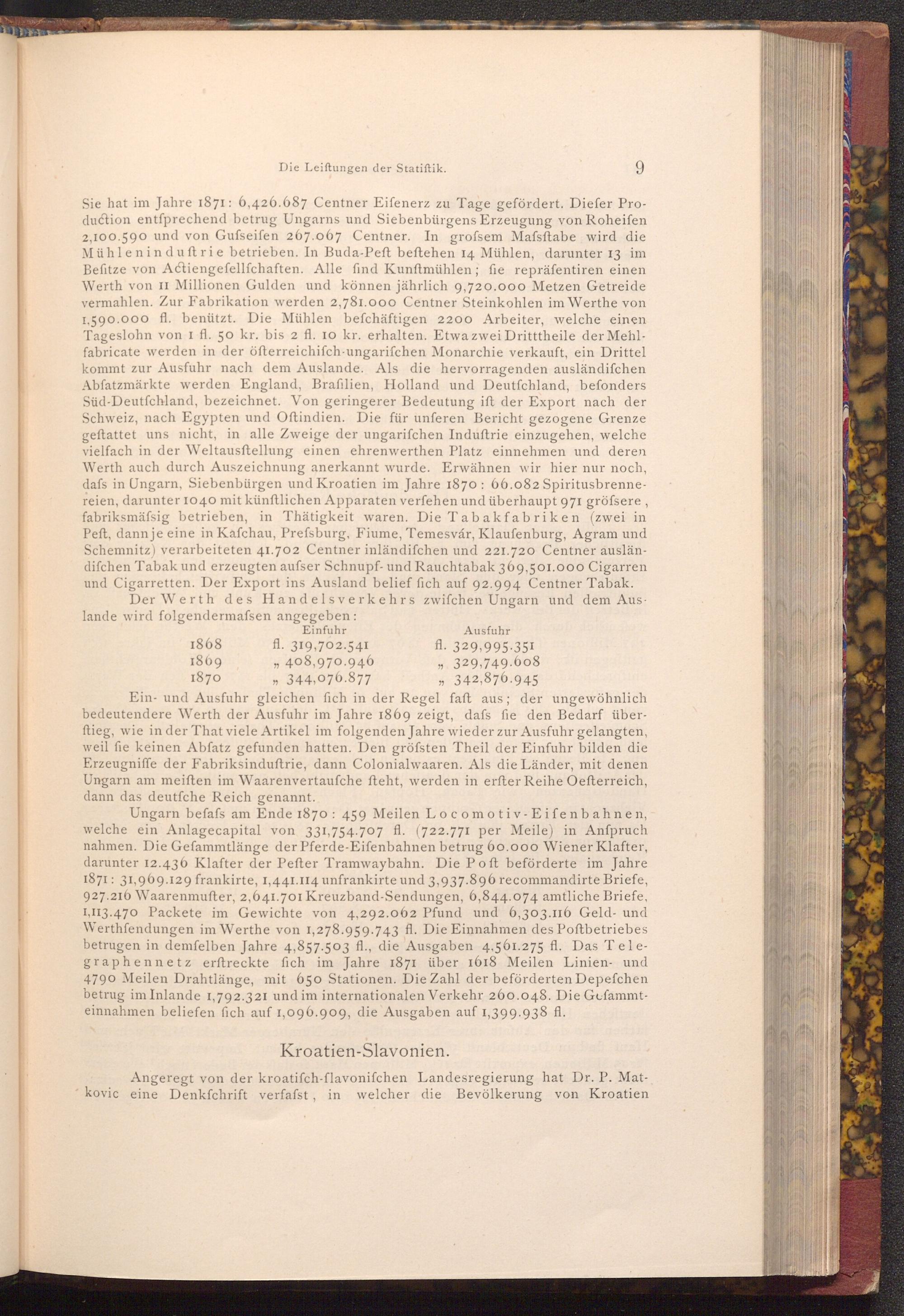 Ein- und Ausfuhr gleichen fich in der Regel faft aus; der ungewöhnlich bedeutendere Werth der Ausfuhr im Jahre 1869 zeigt, dafs fie den Bedarf überftieg, wie in der That viele Artikel im folgenden Jahre wieder zur Ausfuhr gelangten, weil fie keinen Abfatz gefunden hatten. Den gröfsten Theil der Einfuhr bilden die Erzeugniffe der Fabriksinduftrie, dann Colonialwaaren. Als die Länder, mit denen Ungarn am meiften im Waarenvertaufche fteht, werden in erfter Reihe Oefterreich, dann das deutfche Reich genannt.