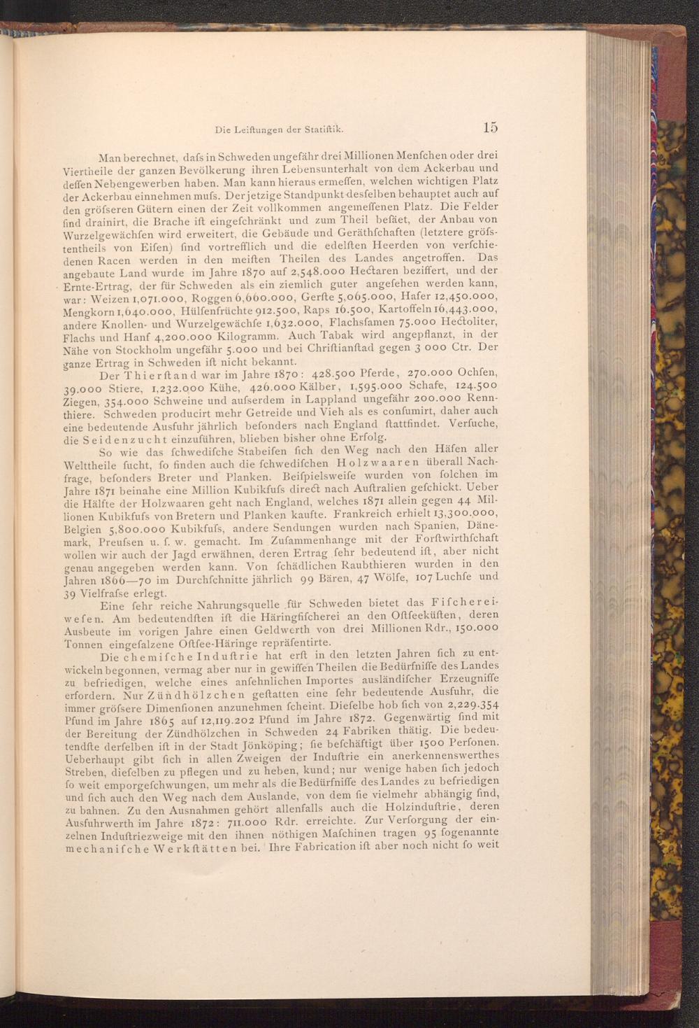 Der Thierftand war im Jahre 1870: 428.500 Pferde, 270.000 Ochfen, 39.000 Stiere, 1,232.000 Kühe, 426.000 Kälber, 1,595.000 Schafe, 124.500 Ziegen, 354.000 Schweine und aufserdem in Lappland ungefähr 200.000 Rennthiere. Schweden producirt mehr Getreide und Vieh als es confumirt, daher auch eine bedeutende Ausfuhr jährlich befonders nach England ftattfindet. Verfuche, die Seidenzucht einzuführen, blieben bisher ohne Erfolg.