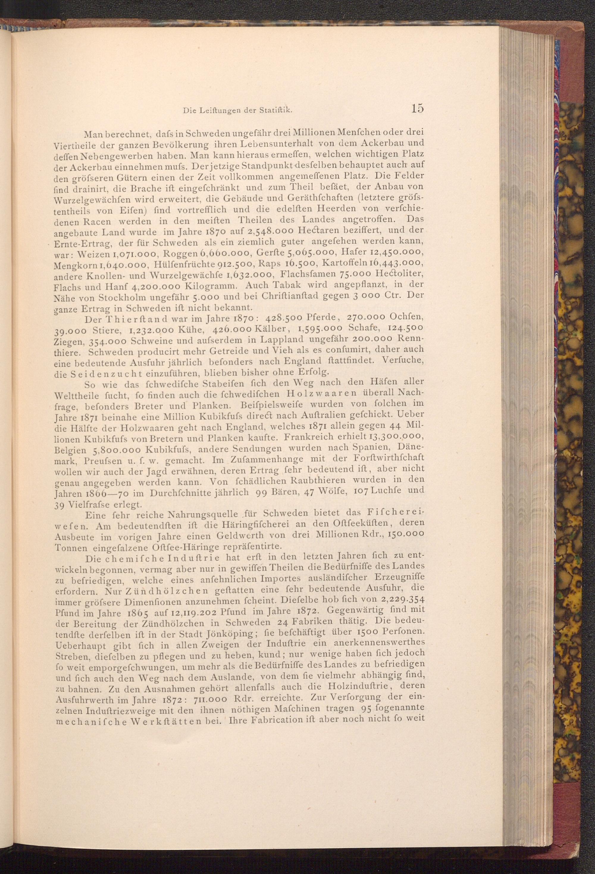 Man berechnet, dafs in Schweden ungefähr drei Millionen Menfchen oder drei Viertheile der ganzen Bevölkerung ihren Lebensunterhalt von dem Ackerbau und deffen Nebengewerben haben. Man kann hieraus ermeffen, welchen wichtigen Platz der Ackerbau einnehmen mufs. Der jetzige Standpunkt desfelben behauptet auch auf den gröfseren Gütern einen der Zeit vollkommen angemeffenen Platz. Die Felder find drainirt, die Brache ift eingefchränkt und zum Theil befäet, der Anbau von Wurzelgewächfen wird erweitert, die Gebäude und Geräthfchaften( letztere gröfstentheils von Eifen) find vortrefflich und die edelften Heerden von verfchiedenen Racen werden in den meiften Theilen des Landes angetroffen. Das angebaute Land wurde im Jahre 1870 auf 2,548.000 Hectaren beziffert, und der Ernte- Ertrag, der für Schweden als ein ziemlich guter angefehen werden kann, war: Weizen 1,071.000, Roggen 6,660.000, Gerfte 5,065.000, Hafer 12,450.000, Mengkorn 1,640.000, Hülfenfrüchte 912.500, Raps 16.500, Kartoffeln 16,443.000, andere Knollen- und Wurzelgewächfe 1,632.000, Flachsfamen 75.000 Hectoliter, Flachs und Hanf 4,200.000 Kilogramm. Auch Tabak wird angepflanzt, in der Nähe von Stockholm ungefähr 5.000 und bei Chriftianftad gegen 3 000 Ctr. Der ganze Ertrag in Schweden ift nicht bekannt.