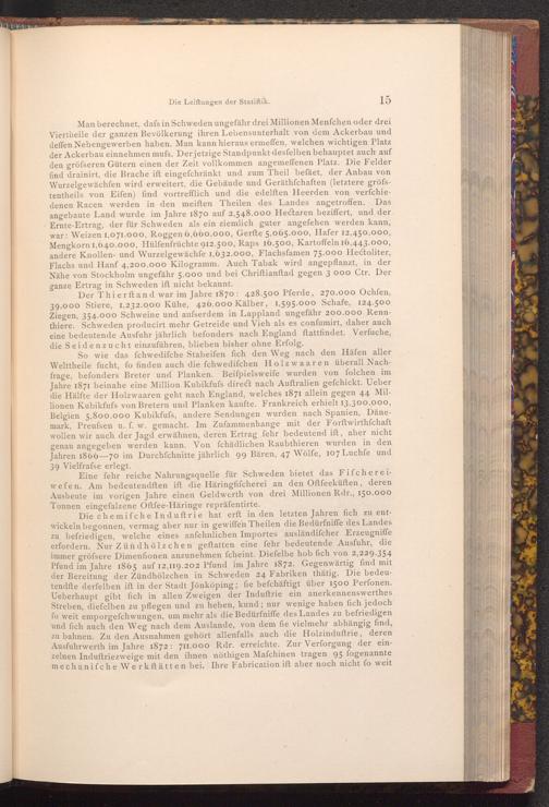 Die chemifche Induftrie hat erft in den letzten Jahren fich zu entwickeln begonnen, vermag aber nur in gewiffen Theilen die Bedürfniffe des Landes zu befriedigen, welche eines anfehnlichen Importes ausländifcher Erzeugniffe erfordern. Nur Zündhölzchen geftatten eine fehr bedeutende Ausfuhr, die immer gröfsere Dimenfionen anzunehmen fcheint. Diefelbe hob fich von 2,229.354 Pfund im Jahre 1865 auf 12,119.202 Pfund im Jahre 1872. Gegenwärtig find mit der Bereitung der Zündhölzchen in Schweden 24 Fabriken thätig. Die bedeutendfte derfelben ift in der Stadt Jönköping; fie befchäftigt über 1500 Perfonen. Ueberhaupt gibt fich in allen Zweigen der Induſtrie ein anerkennenswerthes Streben, diefelben zu pflegen und zu heben, kund; nur wenige haben fich jedoch fo weit emporgefchwungen, um mehr als die Bedürfniffe des Landes zu befriedigen und fich auch den Weg nach dem Auslande, von dem fie vielmehr abhängig find, zu bahnen. Zu den Ausnahmen gehört allenfalls auch die Holzinduftrie, deren Ausfuhrwerth im Jahre 1872: 711.000 Rdr. erreichte. Zur Verforgung der einzelnen Induftriezweige mit den ihnen nöthigen Maſchinen tragen 95 fogenannte mechanifche Werkstätten bei. Ihre Fabrication ift aber noch nicht fo weit