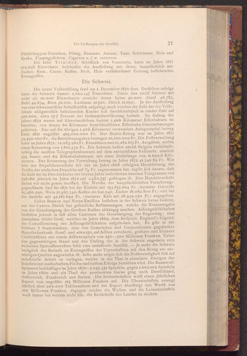 Die letzte Volkszählung fand am I. December 1870 ftatt. Derfelben zufolge hatte die Schweiz damals 2,669.147 Einwohner. Unter den zwölf Städten mit mehr als 10.000 Einwohnern erreicht deren keine 50.000( Genf 46.783, Bafel 44.834, Bern 36.001, Laufanne 21.520, Zürich 21.199). In der Ausstellung war eine fchweizerifche Schulftatiftik aufgelegt, nach welcher die Zahl der die Volksfchule obligatorifch befuchenden Kinder fich durchſchnittlich in runder Zahl auf 420.000, etwa 15.7 Percent der Gefammtbevölkerung beläuft. Im Anfang des Jahres 1872 waren auf fchweizerifchem Gebiet 1.466 Kilometer Eifenbahnen im Betriebe, von denen 60 Kilometer fremdländifchen Eifenbahn- Unternehmungen. gehörten. Das auf die übrigen 1.406 Kilometer verwendete Anlagecapital betrug Ende 1871 ungefähr 465,000.000 Fr. Der Brutto- Ertrag war im Jahre 1871 39,490.000 Fr., die Betriebsausgaben betrugen 20,100.000 Fr. Die Poftverwaltung hatte im Jahre 1872: 12,083.982 Fr. Einnahmen und 10,282.613 Fr. Ausgaben, mithin einen Reinertrag von 1,801.339 Fr. Die Schweiz befitzt nächft Belgien verhältnifsmäfsig die meiften Telegraphenbureaux auf dem europäifchen Feftlande, nämlich 554 Staats- und 69 Eifenbahnbureaux mit einer Drahtlänge von 11.699.6 Kilometern. Der Reinertrag der Verwaltung betrug im Jahre 1872 41.346 89 Fr. Wie fehr der Depefchenverkehr feit der im Jahre 1868 erfolgten Herabfetzung des Preifes der einfachen Depefche auf 1/2 Fr. zugenommen hat, ergibt fich daraus, dafs die Zahl der im Durchfchnitte der letzten Jahre beförderten internen Telegramme von 798.186 jährlich im Jahre 1872 auf 1,480.757 geftiegen ift. Den Handelsverkehr finden wir nicht genau beziffert. Die Werthe der hauptfächlichften Verzehrungsgegenftände find für 1871 bei der Einfuhr mit 153,855.664 Fr.( darunter Getreide 63,480.290, Wein 21,467.340, Kaffee 20,641.940, Zucker 18,082.800 Fr.) und bei der Ausfuhr mit 42,187.692 Fr.( darunter Käfe mit 28,939.050 Fr.) angegeben. Ueber Banken und Noten- Emiffion beftehen in der Schweiz keine Gefetze, nur der Canton Zürich hat gefetzliche Beftimmungen, welche die Notenausgabe von der Genehmigung des Grofsen Rathes abhängig machen. Actiengeſellſchaften bedürfen jedoch in faft allen Cantonen der Genehmigung der Regierung; eine Ausnahme bildet Genf, welches im Jahre 1869, dem Beiſpiele England's folgend, die Conceffionirung der Actiengeſellſchaften aufgehoben hat. Es gibt in der Schweiz 7 Staatsbanken, eine von Gemeinden und Corporationen gegründete Hypothekenbank( Genf) und etwa 150, auf Actien errichtete, gröfsere und kleinere Creditinftitute mit einem Actiencapitale von 250-300 Millionen Franken. Ueber den gegenwärtigen Stand und den Umfang des in der Schweiz ungemein entz wickelten Sparcaffenwefens fehlt eine umfaffende Statiftik. Je mehr die Schweiz bezüglich des Bedarfs an Erzeugniffen der Urproduction auf den Bezug aus auswärtigen Quellen angewiefen ift, defto mehr zeigte fich die Nothwendigkeit fich auf induftrielle Arbeit zu verlegen, welche in der That in einzelnen Zweigen der Induftrie mit mufterhaftem Fleifse und beftem Erfolge betrieben wird. Die BaumwollSpinnerei befchäftigte im Jahre 1870: 2,059.351 Spindeln, gegen 1,602.109 Spindeln im Jahre 1860 und ein Theil der producirten Garne ging nach Deutſchland, Oefterreich, Frankreich und Italien. Die Seideninduftrie weift einen jährlichen Export von ungefähr 215 Millionen Franken auf. Die Uhreninduftrie erzeugt jährlich über 200.000 Tafchenuhren und der Export überfteigt den Werth von 100 Millionen Franken, dagegen reichte die Wollen- und die Leineninduftrie noch immer bei weitem nicht hin, die Bedürfniffe des Landes zu decken.