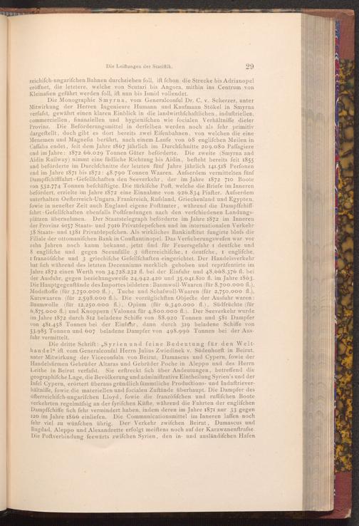 Die Monographie Smyrna, vom Generalconful Dr. C. v. Scherzer, unter Mitwirkung der Herren Ingenieure Humann und Kaufmann Stökel in Smyrna verfafst, gewährt einen klaren Einblick in die landwirthschaftlichen, induftriellen, commerciellen, finanziellen und hygienifchen wie focialen Verhältniffe diefer Provinz. Die Beförderungsmittel in derfelben werden noch als fehr primitiv dargeftellt, doch gibt es dort bereits zwei Eifenbahnen, von welchen die eine Menemen und Magneſia berührt, nach einem Laufe von 68 englifchen Meilen in Caffaba endet, feit dem Jahre 1867 jährlich im Durchschnitte 209.080 Paffagiere und im Jahre 1872 66.029 Tonnen Güter beförderte. Die zweite( Smyrna and Aidin Railway) nimmt eine füdliche Richtung bis Aidin, befteht bereits feit 1855 und beförderte im Durchfchnitte der letzten fünf Jahre jährlich 141.518 Perfonen und im Jahre 1871 bis 1872: 48.790 Tonnen Waaren. Ausserdem vermittelten fünf Dampffchifffahrt- Gefellſchaften den Seeverkehr, der im Jahre 1872 710 Boote von 532.774 Tonnen befchäftigte. Die türkifche Poft, welche die Briefe im Inneren befördert, erzielte im Jahre 1872 eine Einnahme von 926.834 Piafter. Ausserdem unterhalten Oefterreich- Ungarn, Frankreich, Rufsland, Griechenland und Egypten, fowie in neuefter Zeit auch England eigene Poftämter, während die Dampffchifffahrt Gefellſchaften ebenfalls Poftfendungen nach den verfchiedenen Landungsplätzen übernehmen. Der Staatstelegraph beförderte im Jahre 1872 im Inneren der Provinz 6157 Staats- und 7916 Privatdepefchen und im internationalen Verkehr 38 Staats- und 1381 Privatdepefchen. Als wirkliches Bankinftitut fungirte blofs die Filiale der ottomanifchen Bank in Conftantinopel. Das Verficherungswefen war vor zehn Jahren noch kaum bekannt, jetzt find für Feuersgefahr I deutſche und 8 englifche und gegen Seeunfälle 3 öfterreichifche, I deutfche, I englifche, I franzöfifche und 3 griechifche Gefellſchaften eingerichtet. Der Handelsverkehr hat fich während des letzten Decenniums merklich gehoben und repräfentirte im Jahre 1872 einen Werth von 34,728.232 fl. bei der Einfuhr und 48,668.376 fl. bei der Ausfuhr, gegen beziehungsweife 24,942.420 und 35,041.810 fl. im Jahre 1863. Die Hauptgegenstände des Importes bildeten: Baumwoll- Waaren( für 8,700.000 fl.), Modeftoffe( für 3,750.000 fl.), Tuche und Schafwoll- Waaren( für 2,750.000 fl.), Kurzwaaren( für 2,598.000 fl.). Die vorzüglichften Objecte der Ausfuhr waren: Baumwolle( für 12,250.000 fl.), Opium( für 6,340.000 fl.), Südfrüchte( für 6,875.000 fl.) und Knoppern( Valonea für 4,800.000 fl.). Der Seeverkehr wurde im Jahre 1872 durch 812 beladene Schiffe von 88.920 Tonnen und 581 Dampfer von 481.458 Tonnen bei der Einfuhr, dann durch 319 beladene Schiffe von 53.985 Tonnen und 607 beladene Dampfer von 498.996 Tonnen bei der Ausfuhr vermittelt.