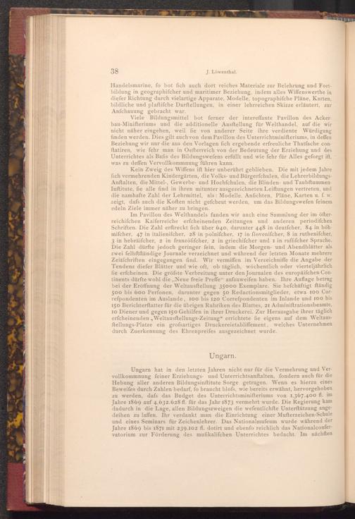 Ungarn hat in den letzten Jahren nicht nur für die Vermehrung und Vervollkommnung feiner Erziehungs- und Unterrichtsanftalten, fondern auch für die Hebung aller anderen Bildungsinftitute Sorge getragen. Wenn es hierzu eines Beweifes durch Zahlen bedarf, fo braucht blofs, wie bereits erwähnt, hervorgehoben zu werden, dafs das Budget des Unterrichtsminifteriums von 1,367.400 fl. im Jahre 1869 auf 4,632.628 fl. für das Jahr 1873 vermehrt wurde. Die Regierung kam dadurch in die Lage, allen Bildungszweigen die wefentlichfte Unterſtützung angedeihen zu laffen. Ihr verdankt man die Einrichtung einer Mufterzeichen- Schule und eines Seminars für Zeichenlehrer. Das Nationalmufeum wurde während der Jahre 1869 bis 1871 mit 239.102 fl. dotirt und ebenfo reichlich das National confervatorium zur Förderung des mufikalifchen Unterrichtes bedacht. Im nächften
