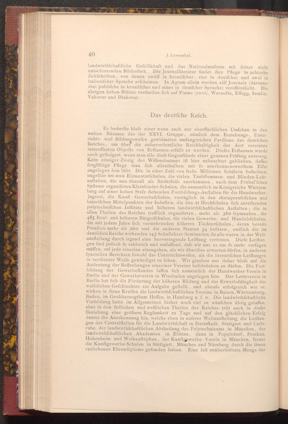 Es bedurfte blofs einer wenn auch nur oberflächlichen Umfchau in den weiten Räumen des der XXVI. Gruppe, nämlich dem Erziehungs-, Unterrichts- und Bildungswefen gewidmeten umfangreichen Pavillons des deutfchen Reiches, um über die aufserordentliche Reichhaltigkeit der dort vereinten intereffanten Objecte von Erftaunen erfüllt zu werden. Diefes Erftaunen wurde noch gefteigert, wenn man alle diefe Gegenftände einer genauen Prüfung unterzog. Kein einziger Zweig des Wiffensbaumes ift hier unbeachtet geblieben, deffen forgfältige Pflege man fich allenthalben mit fo anerkennenswerthem Eifer angelegen fein läfst. Die in einer Zahl von fechs Millionen Schülern befuchten, ungefähr 60.000 Elementarfchulen, die vielen Taubftummen- und Blinden- Lehranftalten, die nun überall als Bedürfnifs anerkannten, nach dem Fröbel'fchen Syfteme organifirten Kleinkinder- Schulen, die namentlich im Königreiche Württem berg auf einer hohen Stufe ftehenden Fortbildungs- Anftalten für die Handwerkerjugend, die Kunft Gewerbefchulen, vorzüglich in den rheinpreufsifchen und baierifchen Mittelpunkten der Induftrie, die den 21 Hochſchulen fich anreihenden polytechnifchen Inftitute und höheren landwirthfchaftlichen Anftalten; die in allen Theilen des Reiches trefflich organifirten, mehr als 380 Gymnafien, die 485 Real- and höheren Bürgerfchulen, die vielen Gewerbe- und Handelsfchulen, die mit jedem Jahre fich vermehrenden höheren Töchterfchulen, deren bereits Preufsen mehr als 260 und die anderen Staaten 54 befitzen, endlich die im deutfchen Reiche wirkenden 143 Schullehrer- Seminarien, fie alle waren in der Weltausftellung durch irgend eine hervorragende Leiftung vertreten. Diefe Leiftungen find jedoch fo zahlreich und umfaffend, dafs wir uns es um fo mehr verfagen müffen, auf jede einzelne einzugehen, als wir überdies erwarten dürfen, in anderen fpeciellen Berichten fowohl das Unterrichtswefen, als die literarifchen Leiftungen in verdienter Weife gewürdiget zu fehen. Wir glauben uns daher blofs auf die Andeutung der Beftrebungen einzelner Vereine befchränken zu dürfen. Die Fortbildung des Gewerbeftandes laffen fich namentlich der Handwerker- Verein in Berlin und der Gewerbeverein in Wiesbaden angelegen fein. Der Letteverein in Berlin hat fich die Förderung der höheren Bildung und der Erwerbsfähigkeit des weiblichen Gefchlechtes zur Aufgabe geftellt, und ebenfo erfolgreich wie er, wirken in ihren Kreifen die landwirthfchaftlichen Vereine in Baiern, Württemberg, Baden, im Grofsherzogthum Heffen, in Hamburg u. f. w. Die landwirthfchaftliche Vorbildung hatte im Allgemeinen bisher noch viel zu wünfchen übrig gelaffen, aber in den füdlichen und weftlichen Theilen des Reiches tritt auch in diefer Beziehung eine gröfsere Regfamkeit zu Tage und auf den glücklichen Erfolg deutet die Anerkennung hin, welche eben in unferer Weltausftellung die Leiftungen der Centralftellen für die Landwirthfchaft in Darmſtadt, Stuttgart und Carlsruhe, der landwirthfchaftlichen Abtheilung des Polytechnicums in München, der landwirthschaftlichen Akademien in Eldena, dann in Popelsdorf, Proskau, Hohenheim und Weihenftephan, der Kunftgewerbe- Verein in München, ferner die Kunstgewerbe- Schulen in Stuttgart, München und Nürnberg durch die ihnen verliehenen Ehrendiplome gefunden haben. Eine faft unüberfehbare Menge der