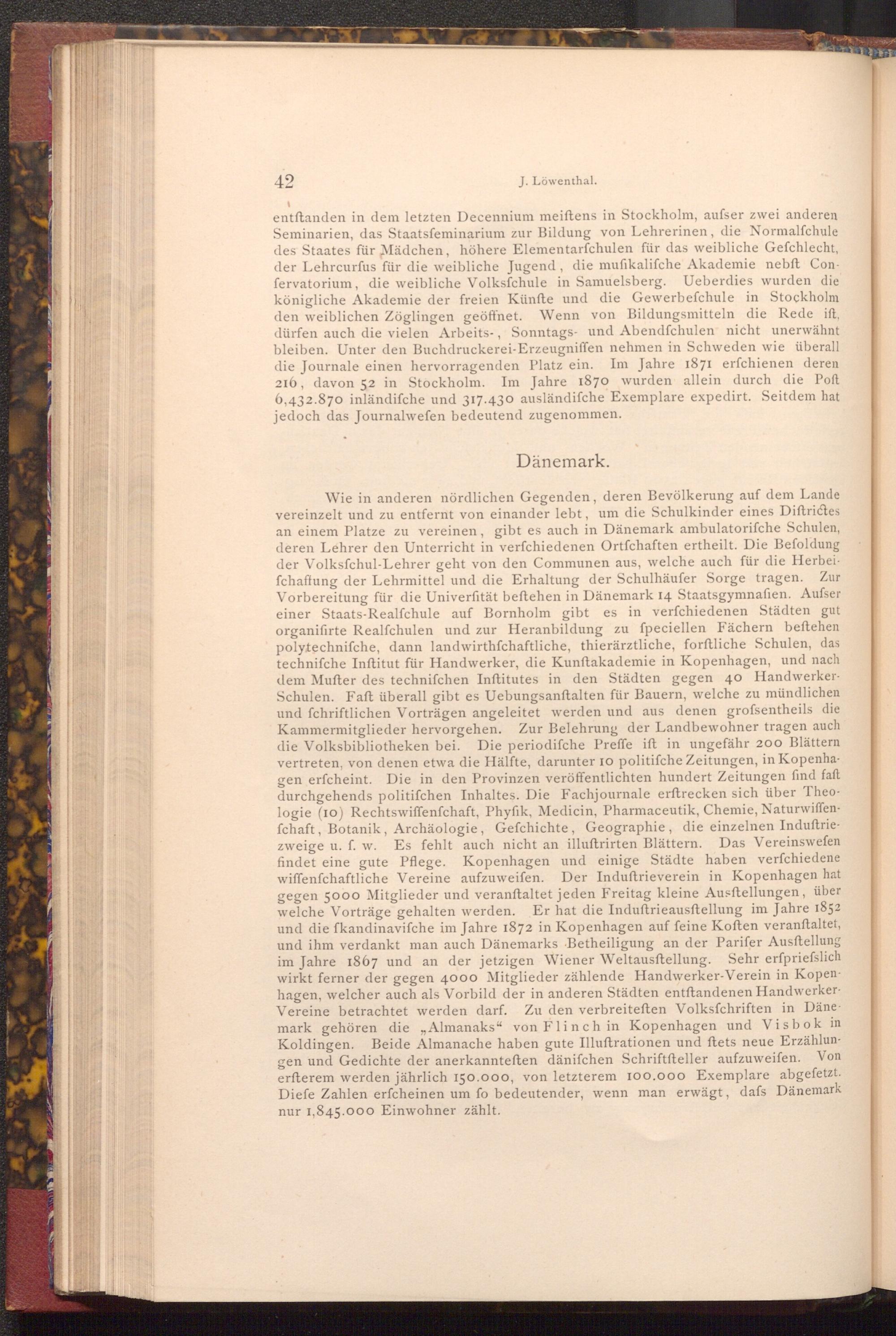 Wie in anderen nördlichen Gegenden, deren Bevölkerung auf dem Lande vereinzelt und zu entfernt von einander lebt, um die Schulkinder eines Diftrictes an einem Platze zu vereinen, gibt es auch in Dänemark ambulatorifche Schulen, deren Lehrer den Unterricht in verfchiedenen Ortſchaften ertheilt. Die Befoldung der Volksfchul- Lehrer geht von den Communen aus, welche auch für die Herbeifchaffung der Lehrmittel und die Erhaltung der Schulhäufer Sorge tragen. Zur Vorbereitung für die Univerfität beſtehen in Dänemark 14 Staatsgymnafien. Aufser einer Staats- Realfchule auf Bornholm gibt es in verfchiedenen Städten gut organifirte Realfchulen und zur Heranbildung zu fpeciellen Fächern beftehen polytechniſche, dann landwirthfchaftliche, thierärztliche, forftliche Schulen, das techniſche Inftitut für Handwerker, die Kunftakademie in Kopenhagen, und nach dem Mufter des techniſchen Inftitutes in den Städten gegen 40 HandwerkerSchulen. Faft überall gibt es Uebungsanftalten für Bauern, welche zu mündlichen und fchriftlichen Vorträgen angeleitet werden und aus denen grofsentheils die Kammermitglieder hervorgehen. Zur Belehrung der Landbewohner tragen auch die Volksbibliotheken bei. Die periodifche Preffe ift in ungefähr 200 Blättern vertreten, von denen etwa die Hälfte, darunter 10 politifche Zeitungen, in Kopenhagen erfcheint. Die in den Provinzen veröffentlichten hundert Zeitungen find faft durchgehends politifchen Inhaltes. Die Fachjournale erftrecken sich über Theologie( 10) Rechtswiffenfchaft, Phyfik, Medicin, Pharmaceutik, Chemie, Naturwiffenfchaft, Botanik, Archäologie, Gefchichte, Geographie, die einzelnen Induſtriezweige u. f. w. Es fehlt auch nicht an illuftrirten Blättern. Das Vereinswefen findet eine gute Pflege. Kopenhagen und einige Städte haben verfchiedene wiffenfchaftliche Vereine aufzuweifen. Der Induftrieverein in Kopenhagen hat gegen 5000 Mitglieder und veranſtaltet jeden Freitag kleine Ausftellungen, über welche Vorträge gehalten werden. Er hat die Induftrieausftellung im Jahre 1852 und die fkandinavifche im Jahre 1872 in Kopenhagen auf feine Koften veranſtaltet, und ihm verdankt man auch Dänemarks Betheiligung an der Parifer Ausftellung im Jahre 1867 und an der jetzigen Wiener Weltausftellung. Sehr erfpriefslich wirkt ferner der gegen 4000 Mitglieder zählende Handwerker- Verein in Kopenhagen, welcher auch als Vorbild der in anderen Städten entstandenen HandwerkerVereine betrachtet werden darf. Zu den verbreiteften Volksfchriften in Dänemark gehören die Almanaks" von Flinch in Kopenhagen und Visbok in Koldingen. Beide Almanache haben gute Illuftrationen und ftets neue Erzählungen und Gedichte der anerkannteften dänifchen Schriftfteller aufzuweifen. Von erfterem werden jährlich 150.000, von letzterem 100.000 Exemplare abgefetzt. Diefe Zahlen erfcheinen um fo bedeutender, wenn man erwägt, dafs Dänemark nur 1,845.000 Einwohner zählt.