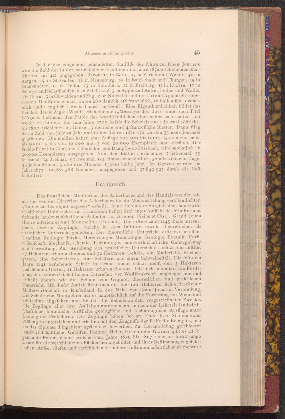 In der fehr eingehend behandelten Statiſtik der fchweizerifchen Journale wird die Zahl der in den verfchiedenen Cantonen im Jahre 1872 erfchienenen Zeitfchriften auf 412 angegeben, davon 64 in Bern, 47 in Zürich und Waadt, 40 in Aargau, 25 in St. Gallen, 18 in Neuenburg, 16 in Bafel Stadt und Thurgau, 15 in Graubündten, 14 in Teffin, 13 in Solothurn, 12 in Freiburg, II in Luzern, 10 in Schwyz und Schaffhaufen, ó in Bafel Land, 5 in Appenzell Aufserrhoden und Wallis, 4 in Glarus, 3 in Obwalden und Zug, 2 im Nidwalde und I in Uri und Appenzell Innerrhoden. Der Sprache nach waren 266 deutfch, 118 franzöfifch, 16 italienifch, 5 romanifch und I englifch( ,, Swifs Times" in Genf). Eine Eigenthümlichkeit bildet das Beiblatt des in Aigle( Waadt) erfcheinenden„ Messager des alpes" unter dem Titel L'Agace, beftimmt den Patois des waadtländifchen Oberlandes zu erhalten und weiter zu bilden. Bis zum Jahre 1700 befafs die Schweiz nur I Journal( Zürich); bis 1800 erfchienen im Ganzen 3 deutfche und 4 franzöfifche Blätter. Dann ftieg deren Zahl von Jahr zu Jahr und in den Jahren 1871-72 wurden 53 neue Journale gegründet. Die meiſten haben eine Auflage von 500 bis 1000, 15 eine von mehr als 5000, 5 bis von 10.000 und 3 von 20.000 Exemplaren und darüber. Der Guide- Privat in Genf, ein Eifenbahn- und Dampfboot- Cursbuch, wird monatlich in 50.000 Exemplaren ausgegeben. Von den Blättern erfcheinen 7 fiebenmal, 39 fechsmal, 54 dreimal, 93 zweimal, 134 einmal wöchentlich, 32 alle vierzehn Tage, 44 jeden Monat, 5 alle drei Monate, I jedes halbe Jahr. Im Ganzen wurden im Jahre 1872 90,875.388 Nummern ausgegeben und 37,849.925 durch die Poft befördert.