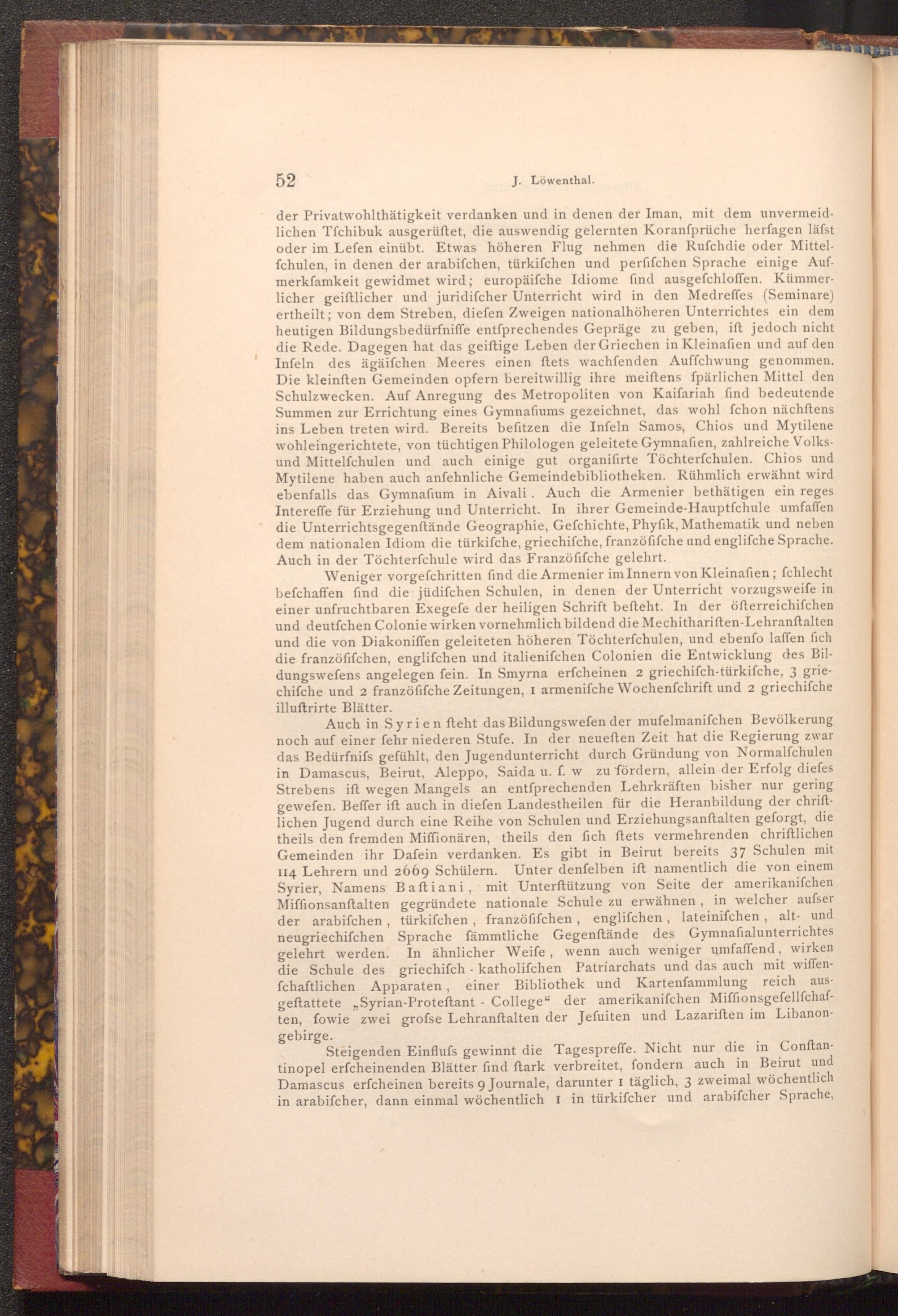 Steigenden Einfluss gewinnt die Tagespreffe. Nicht nur die in Conftantinopel erfcheinenden Blätter find ftark verbreitet, fondern auch in Beirut und Damascus erfcheinen bereits 9 Journale, darunter I täglich, 3 zweimal wöchentlich in arabifcher, dann einmal wöchentlich I in türkifcher und arabifcher Sprache,