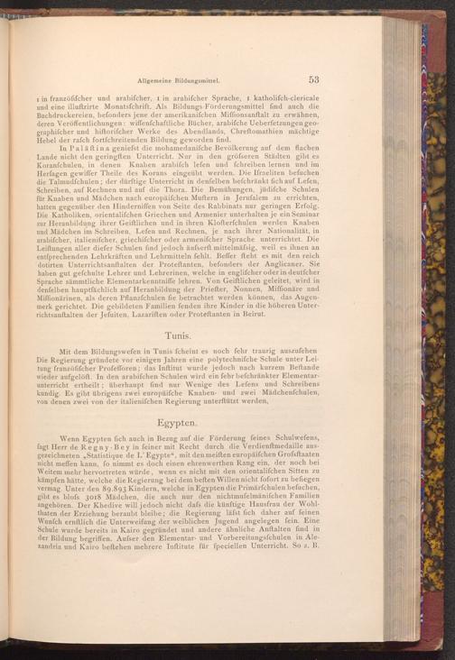 I in franzöfifcher und arabifcher, I in arabifcher Sprache, I katholifch- clericale und eine illuftrirte Monatsfchrift. Als Bildungs- Förderungsmittel find auch die Buchdruckereien, befonders jene der amerikanifchen Miffionsanftalt zu erwähnen, deren Veröffentlichungen: wiffenfchaftliche Bücher, arabifche Ueberfetzungen geographifcher und hiftorifcher Werke des Abendlands, Chreftomathien mächtige Hebel der rafch fortfchreitenden Bildung geworden find.