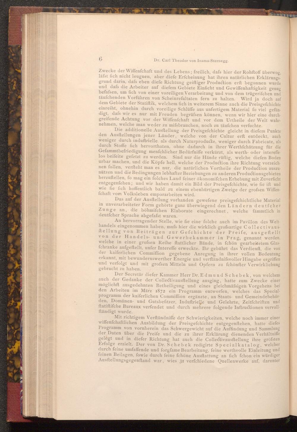 Mit richtigem Verſtändniffe der Schwierigkeiten, welche noch immer einer wiffenfchaftlichen Ausbildung der Preisgefchichte entgegenftehen, hatte diefes Programm von vornherein das Schwergewicht auf die Auffindung und Sammlung der Daten über die Preife und die zu ihrer Erklärung dienenden Verhältniffe gelegt und in diefer Richtung hat auch die Collectivausftellung ihre gröfsten Erfolge erzielt. Der von Dr. Schebek redigirte Specialkatalog, welcher durch feine umfaffende und forgfame Bearbeitung, feine werthvolle Einleitung und feinen Beilagen, fowie durch feine fchöne Ausftattung an fich fchon ein würdiger Ausftellungsgegenstand war, wies 31 verfchiedene Quellenwerke auf, darunter