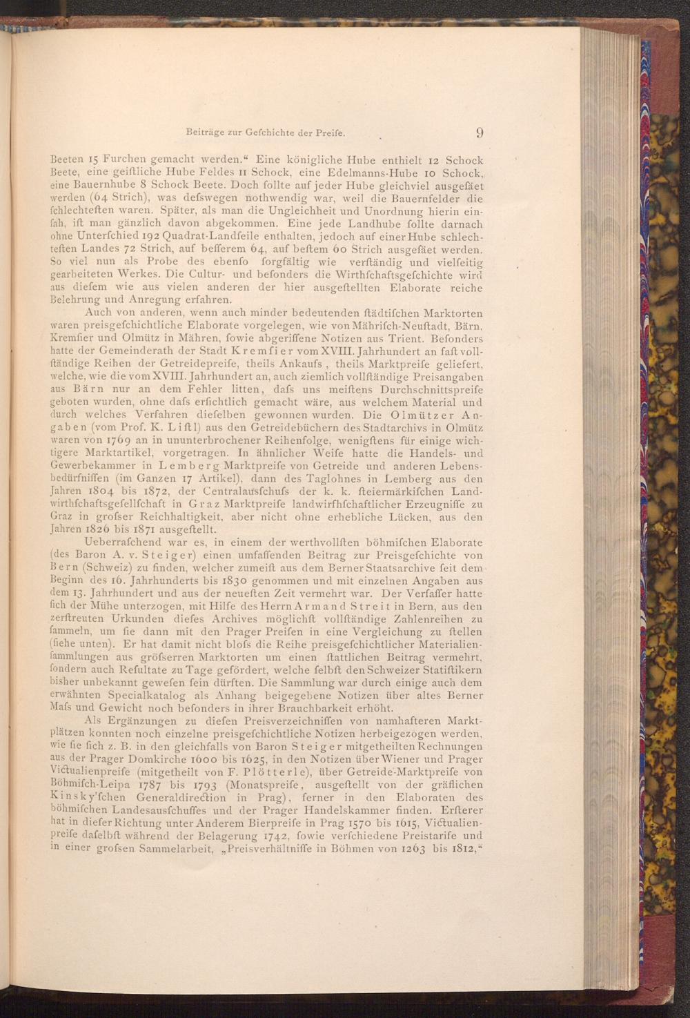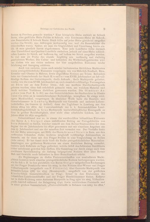 Als Ergänzungen zu diefen Preisverzeichniffen von namhafteren Marktplätzen konnten noch einzelne preisgefchichtliche Notizen herbeigezogen werden, wie fie fich z. B. in den gleichfalls von Baron Steiger mitgetheilten Rechnungen aus der Prager Domkirche 1600 bis 1625, in den Notizen über Wiener und Prager Victualienpreife( mitgetheilt von F. Plötterle), über Getreide- Marktpreife von Böhmifch- Leipa 1787 bis 1793( Monatspreife, ausgeftellt von der gräflichen Kinsky'fchen Generaldirection in Prag), ferner in Prag), ferner in den Elaboraten des böhmifchen Landesausfchuffes und der Prager Handelskammer finden. Erfterer hat in diefer Richtung unter Anderem Bierpreife in Prag 1570 bis 1615, Victualienpreife dafelbft während der Belagerung 1742, fowie verfchiedene Preistarife und in einer grofsen Sammelarbeit,„ Preisverhältniffe in Böhmen von 1263 bis 1812,"