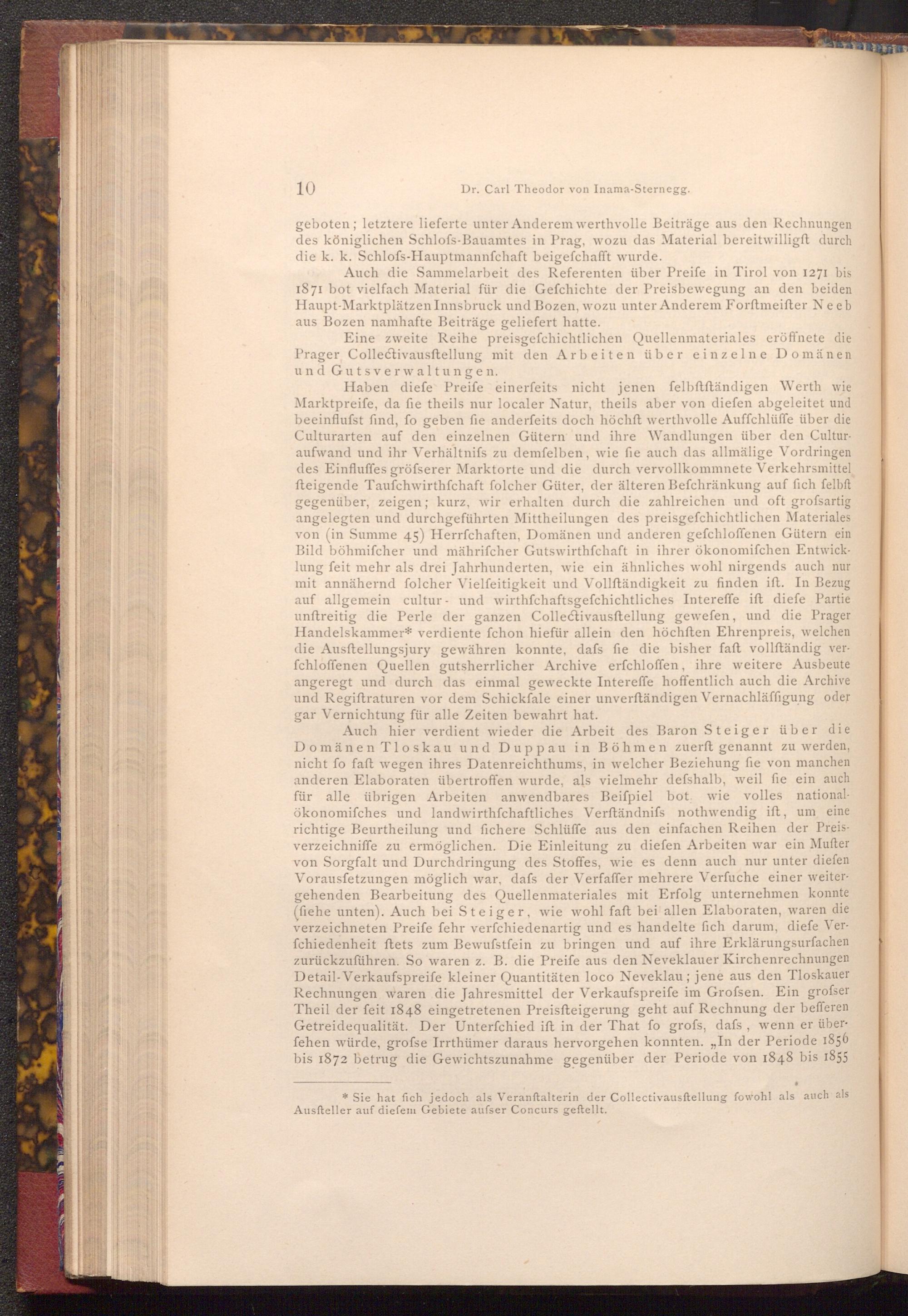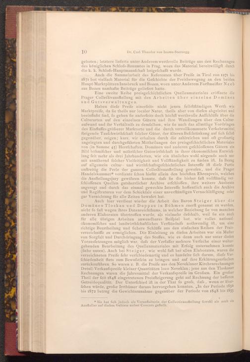Haben diefe Preife einerfeits nicht jenen felbftftändigen Werth wie Marktpreife, da fie theils nur localer Natur, theils aber von diefen abgeleitet und beeinflufst find, fo geben fie anderfeits doch höchft werthvolle Auffchlüffe über die Culturarten auf den einzelnen Gütern und ihre Wandlungen über den Culturaufwand und ihr Verhältnifs zu demfelben, wie fie auch das allmälige Vordringen des Einfluffes gröfserer Marktorte und die durch vervollkommnete Verkehrsmittel fteigende Taufchwirthschaft folcher Güter, der älteren Befchränkung auf fich felbft gegenüber, zeigen; kurz, wir erhalten durch die zahlreichen und oft grofsartig angelegten und durchgeführten Mittheilungen des preisgefchichtlichen Materiales von( in Summe 45) Herrfchaften, Domänen und anderen gefchloffenen Gütern ein Bild böhmifcher und mährifcher Gutswirthfchaft in ihrer ökonomifchen Entwicklung feit mehr als drei Jahrhunderten, wie ein ähnliches wohl nirgends auch nur mit annähernd folcher Vielfeitigkeit und Vollständigkeit zu finden ift. In Bezug auf allgemein cultur und wirthschaftsgefchichtliches Intereffe ift diefe Partie unftreitig die Perle der ganzen Collectivausftellung gewefen, und die Prager Handelskammer* verdiente fchon hiefür allein den höchften Ehrenpreis, welchen die Ausftellungsjury gewähren konnte, dafs fie die bisher faft vollſtändig verfchloffenen Quellen gutsherrlicher Archive erfchloffen, ihre weitere Ausbeute angeregt und durch das einmal geweckte Intereffe hoffentlich auch die Archive und Regiftraturen vor dem Schickfale einer unverftändigen Vernachläffigung oder gar Vernichtung für alle Zeiten bewahrt hat.