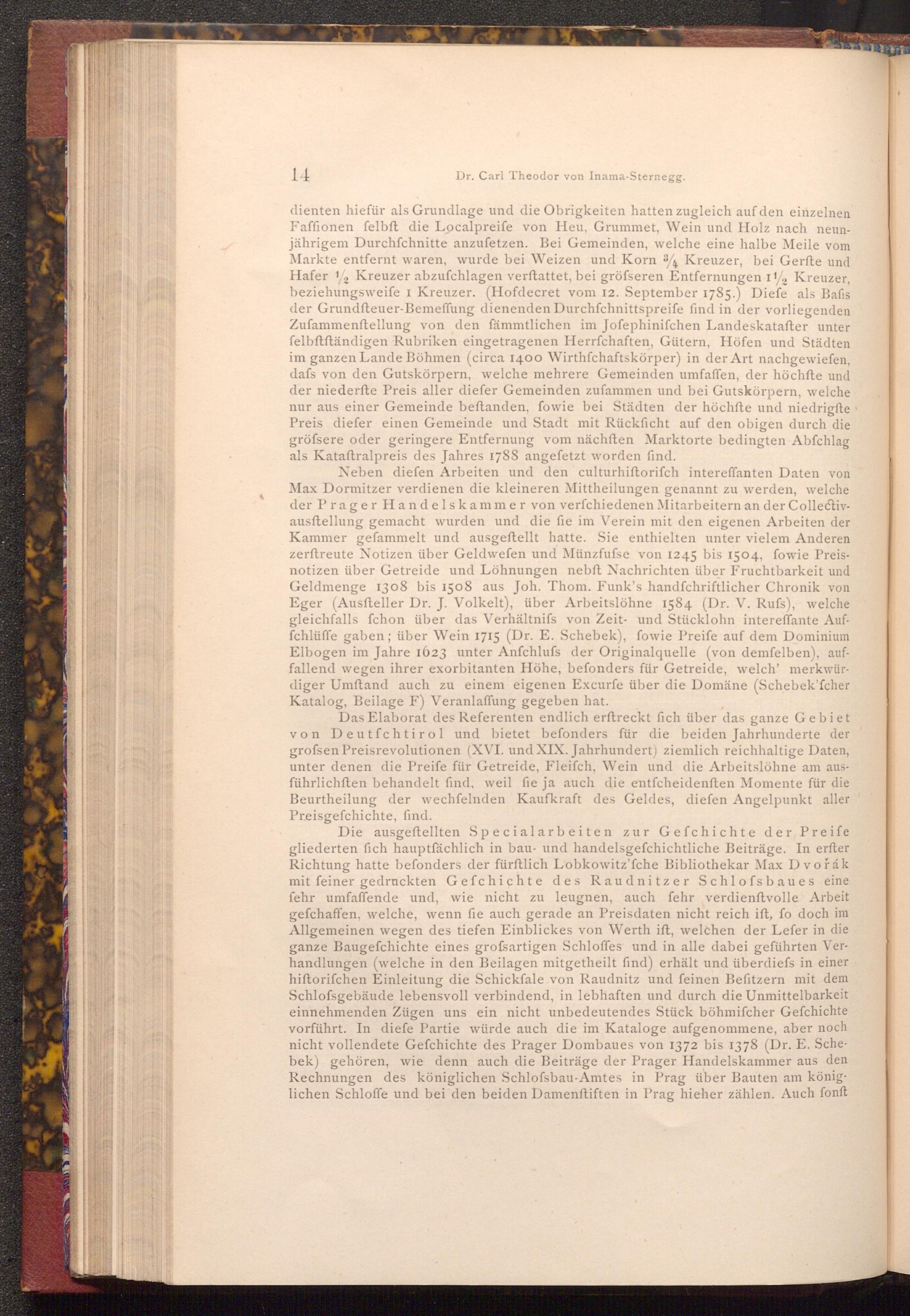 Neben diefen Arbeiten und den culturhiftorifch intereffanten Daten von Max Dormitzer verdienen die kleineren Mittheilungen genannt zu werden, welche der Prager Handelskammer von verfchiedenen Mitarbeitern an der Collectivausftellung gemacht wurden und die fie im Verein mit den eigenen Arbeiten der Kammer gefammelt und ausgeftellt hatte. Sie enthielten unter vielem Anderen zerftreute Notizen über Geldwefen und Münzfufse von 1245 bis 1504, fowie Preisnotizen über Getreide und Löhnungen nebft Nachrichten über Fruchtbarkeit und Geldmenge 1308 bis 1508 aus Joh. Thom. Funk's handfchriftlicher Chronik von Eger( Ausfteller Dr. J. Volkelt), über Arbeitslöhne 1584( Dr. V. Rufs), welche gleichfalls fchon über das Verhältnifs von Zeit- und Stücklohn intereffante Auffchlüffe gaben; über Wein 1715( Dr. E. Schebek), fowie Preife auf dem Dominium Elbogen im Jahre 1623 unter Anfchlufs der Originalquelle( von demfelben), auffallend wegen ihrer exorbitanten Höhe, befonders für Getreide, welch' merkwürdiger Umftand auch zu einem eigenen Excurfe über die Domäne( Schebek'fcher Katalog, Beilage F) Veranlaffung gegeben hat.