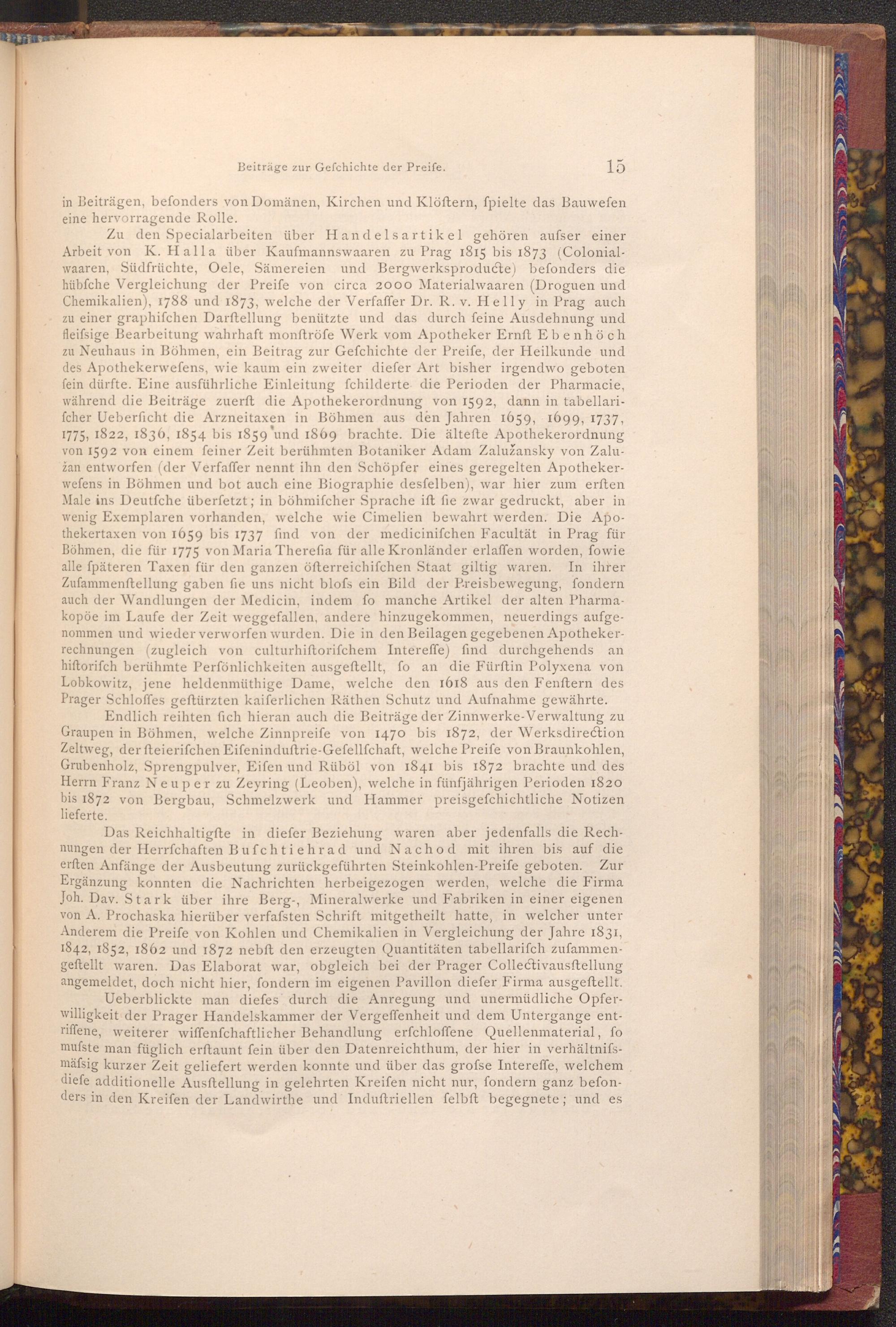 Zu den Specialarbeiten über Handelsartikel gehören aufser einer Arbeit von K. Halla über Kaufmannswaaren zu Prag 1815 bis 1873( Colonialwaaren, Südfrüchte, Oele, Sämereien und Bergwerksproducte) befonders die hübfche Vergleichung der Preife von circa 2000 Materialwaaren( Droguen und Chemikalien), 1788 und 1873, welche der Verfaffer Dr. R. v. Helly in Prag auch zu einer graphifchen Darftellung benützte und das durch feine Ausdehnung und fleifsige Bearbeitung wahrhaft monftröfe Werk vom Apotheker Ernft Ebenhöch zu Neuhaus in Böhmen, ein Beitrag zur Gefchichte der Preife, der Heilkunde und des Apothekerwefens, wie kaum ein zweiter diefer Art bisher irgendwo geboten fein dürfte. Eine ausführliche Einleitung fchilderte die Perioden der Pharmacie, während die Beiträge zuerft die Apothekerordnung von 1592, dann in tabellarifcher Ueberficht die Arzneitaxen in Böhmen aus den Jahren 1659, 1699, 1737, 1775, 1822, 1836, 1854 bis 1859 und 1869 brachte. Die ältefte Apothekerordnung von 1592 von einem feiner Zeit berühmten Botaniker Adam Zalužansky von Zalužan entworfen( der Verfaffer nennt ihn den Schöpfer eines geregelten Apothekerwefens in Böhmen und bot auch eine Biographie desfelben), war hier zum erften Male ins Deutfche überfetzt; in böhmifcher Sprache ift fie zwar gedruckt, aber in wenig Exemplaren vorhanden, welche wie Cimelien bewahrt werden. Die Apothekertaxen von 1659 bis 1737 find von der medicinifchen Facultät in Prag für Böhmen, die für 1775 von Maria Therefia für alle Kronländer erlaffen worden, fowie alle fpäteren Taxen für den ganzen öfterreichifchen Staat giltig waren. In ihrer Zufammenftellung gaben fie uns nicht blofs ein Bild der Preisbewegung, fondern auch der Wandlungen der Medicin, indem fo manche Artikel der alten Pharmakopöe im Laufe der Zeit weggefallen, andere hinzugekommen, neuerdings aufgenommen und wieder verworfen wurden. Die in den Beilagen gegebenen Apothekerrechnungen( zugleich von culturhiftorifchem Intereffe) find durchgehends an hiftorifch berühmte Perfönlichkeiten ausgeftellt, fo an die Fürftin Polyxena von Lobkowitz, jene heldenmüthige Dame, welche den 1618 aus den Fenstern des Prager Schloffes geftürzten kaiferlichen Räthen Schutz und Aufnahme gewährte.