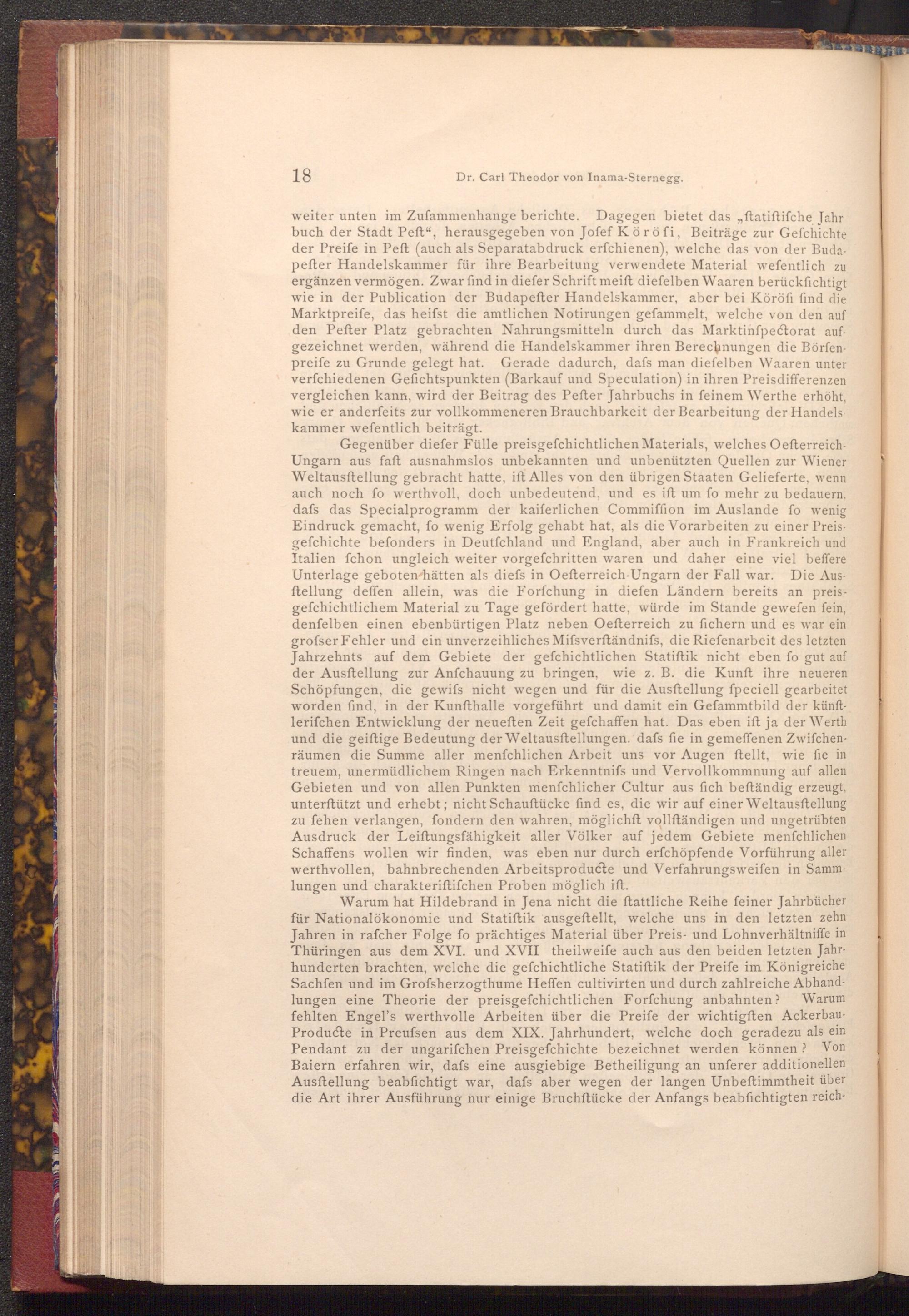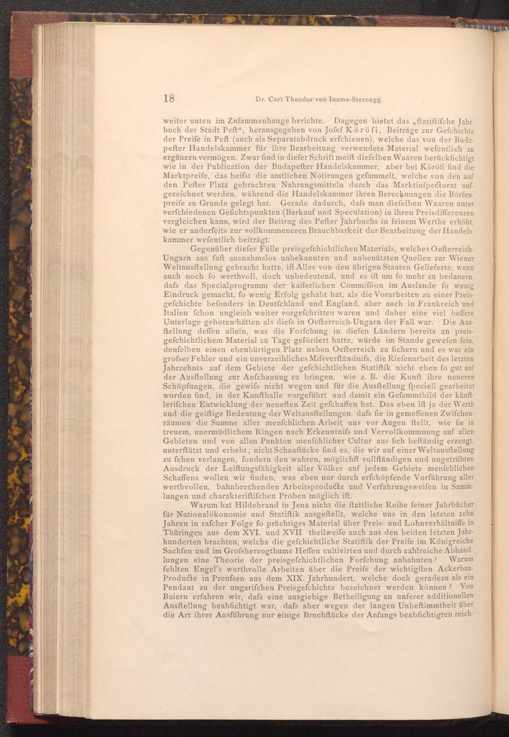 Warum hat Hildebrand in Jena nicht die ftattliche Reihe feiner Jahrbücher für Nationalökonomie und Statiſtik ausgeftellt, welche uns in den letzten zehn Jahren in rafcher Folge fo prächtiges Material über Preis- und Lohnverhältniffe in Thüringen aus dem XVI. und XVII theilweife auch aus den beiden letzten Jahrhunderten brachten, welche die gefchichtliche Statiſtik der Preife im Königreiche Sachfen und im Grofsherzogthume Heffen cultivirten und durch zahlreiche Abhandlungen eine Theorie der preisgefchichtlichen Forfchung anbahnten? Warum fehlten Engel's werthvolle Arbeiten über die Preife der wichtigſten AckerbauProducte in Preufsen aus dem XIX. Jahrhundert, welche doch geradezu als ein Pendant zu der ungarifchen Preisgefchichte bezeichnet werden können? Von Baiern erfahren wir, dafs eine ausgiebige Betheiligung an unferer additionellen Ausftellung beabfichtigt war, dafs aber wegen der langen Unbeftimmtheit über die Art ihrer Ausführung nur einige Bruchſtücke der Anfangs beabsichtigten reich
