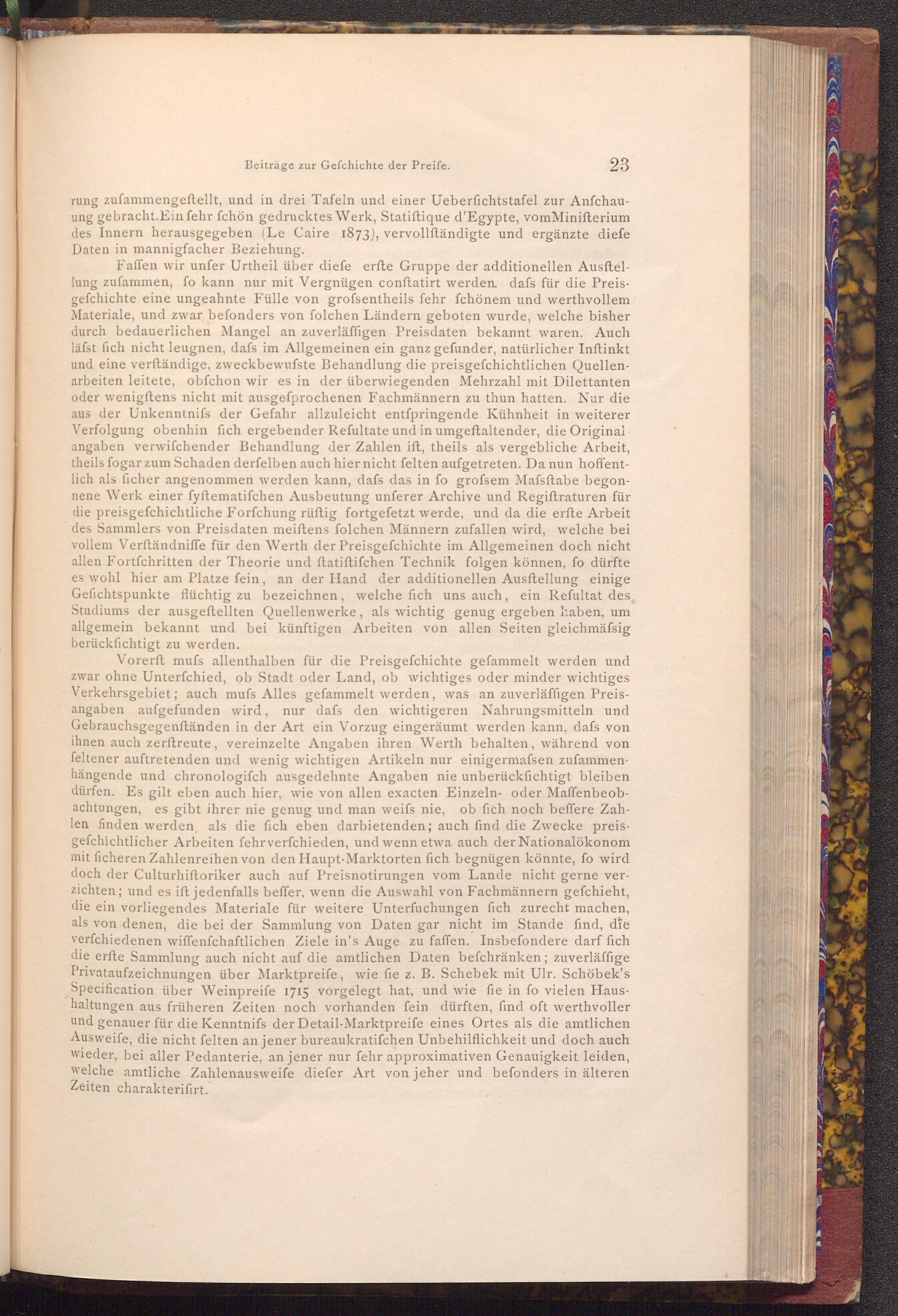 Faffen wir unfer Urtheil über diefe erfte Gruppe der additionellen Ausftellung zufammen, fo kann nur mit Vergnügen conftatirt werden. dafs für die Preisgefchichte eine ungeahnte Fülle von grofsentheils fehr fchönem und werthvollem Materiale, und zwar befonders von folchen Ländern geboten wurde, welche bisher durch bedauerlichen Mangel an zuverläffigen Preisdaten bekannt waren. Auch läfst fich nicht leugnen, dafs im Allgemeinen ein ganz gefunder, natürlicher Inftinkt und eine verſtändige, zweckbewufste Behandlung die preisgefchichtlichen Quellenarbeiten leitete, obfchon wir es in der überwiegenden Mehrzahl mit Dilettanten oder wenigftens nicht mit ausgefprochenen Fachmännern zu thun hatten. Nur die aus der Unkenntnifs der Gefahr allzuleicht entſpringende Kühnheit in weiterer Verfolgung obenhin fich ergebender Refultate und in umgeftaltender, die Original angaben verwifchender Behandlung der Zahlen ift, theils als vergebliche Arbeit, theils fogar zum Schaden derfelben auch hier nicht felten aufgetreten. Da nun hoffentlich als ficher angenommen werden kann, dafs das in fo grofsem Mafsftabe begonnene Werk einer fyftematifchen Ausbeutung unferer Archive und Regiftraturen für die preisgefchichtliche Forfchung rüftig fortgefetzt werde, und da die erfte Arbeit des Sammlers von Preisdaten meiftens folchen Männern zufallen wird, welche bei vollem Verftändniffe für den Werth der Preisgefchichte im Allgemeinen doch nicht allen Fortfchritten der Theorie und ftatiftifchen Technik folgen können, fo dürfte es wohl hier am Platze fein, an der Hand der additionellen Ausftellung einige Gefichtspunkte flüchtig zu bezeichnen, welche fich uns auch, ein Refultat des Studiums der ausgeftellten Quellenwerke, als wichtig genug ergeben haben, um allgemein bekannt und bei künftigen Arbeiten von allen Seiten gleichmässig berücksichtigt zu werden.