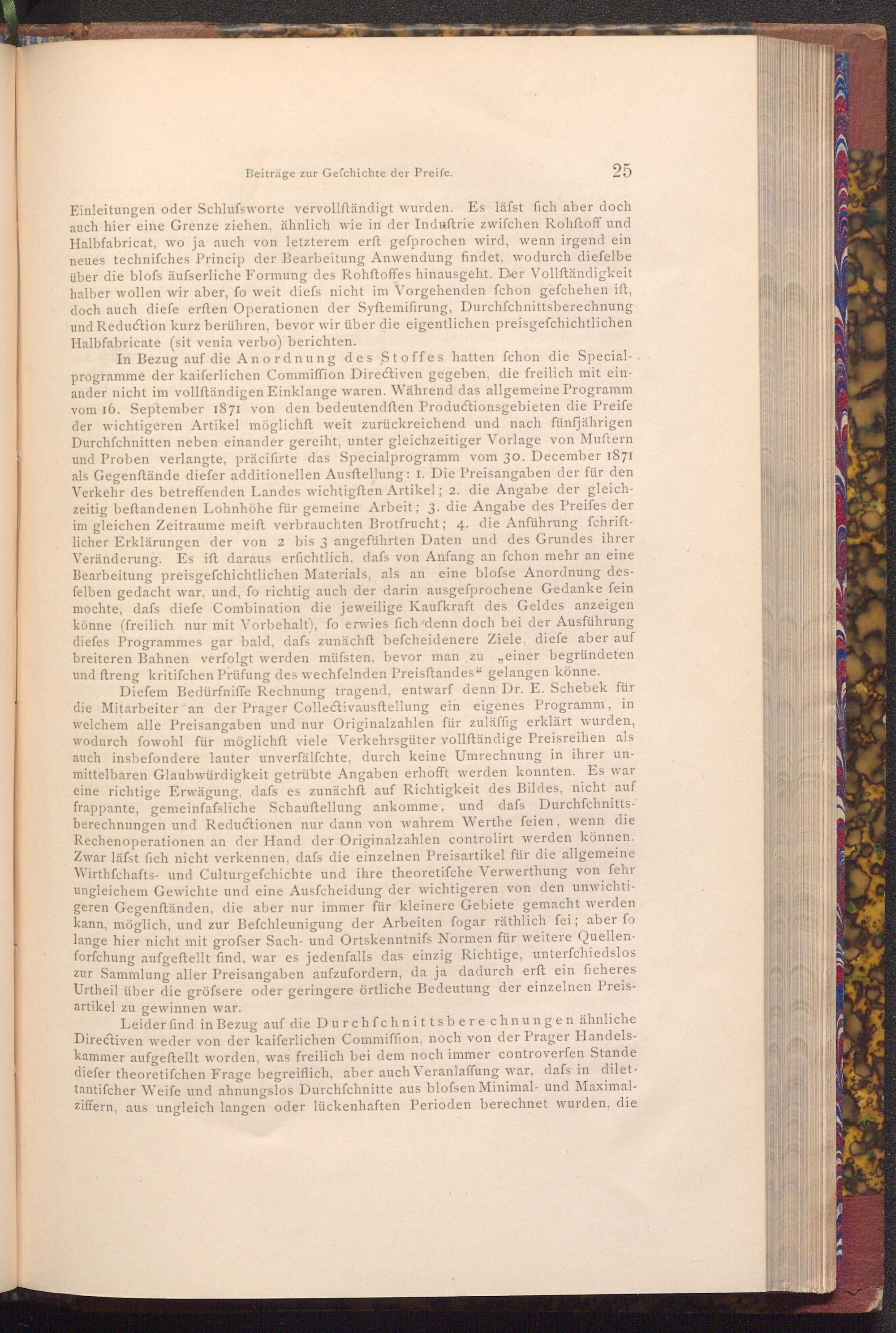 Diefem Bedürfniffe Rechnung tragend, entwarf denn Dr. E. Schebek für die Mitarbeiter an der Prager Collectivausftellung ein eigenes Programm, in welchem alle Preisangaben und nur Originalzahlen für zuläffig erklärt wurden, wodurch fowohl für möglichft viele Verkehrsgüter vollständige Preisreihen als auch insbefondere lauter unverfälfchte, durch keine Umrechnung in ihrer unmittelbaren Glaubwürdigkeit getrübte Angaben erhofft werden konnten. Es war eine richtige Erwägung, dafs es zunächft auf Richtigkeit des Bildes, nicht auf frappante, gemeinfafsliche Schauftellung ankomme, und dafs Durchschnittsberechnungen und Reductionen nur dann von wahrem Werthe feien, wenn die Rechenoperationen an der Hand der Originalzahlen controlirt werden können. Zwar läfst fich nicht verkennen, dafs die einzelnen Preisartikel für die allgemeine Wirthfchafts- und Culturgefchichte und ihre theoretifche Verwerthung von fehr ungleichem Gewichte und eine Ausfcheidung der wichtigeren von den unwichtigeren Gegenftänden, die aber nur immer für kleinere Gebiete gemacht werden kann, möglich, und zur Befchleunigung der Arbeiten fogar räthlich fei; aber fo lange hier nicht mit grofser Sach- und Ortskenntnifs Normen für weitere Quellenforfchung aufgeftellt find, war es jedenfalls das einzig Richtige, unterfchiedslos zur Sammlung aller Preisangaben aufzufordern, da ja dadurch erft ein ficheres Urtheil über die gröfsere oder geringere örtliche Bedeutung der einzelnen Preisartikel zu gewinnen war.