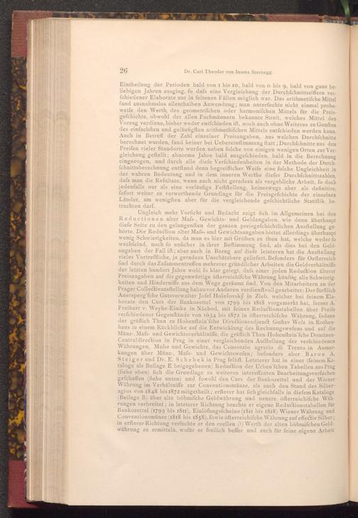 Ungleich mehr Vorficht und Bedacht zeigt fich im Allgemeinen bei den Reductionen alter Mafs-, Gewichts- und Geldangaben, wie denn überhaupt diefe Seite zu den gelungenften der ganzen preisgefchichtlichen Ausftellung gehörte. Die Reduction alter Mafs- und Gewichtsangaben bietet allerdings überhaupt wenig Schwierigkeiten, da man es hier mit Gröfsen zu thun hat, welche weder fo wechfelnd, noch fo unficher in ihrer Beftimmung find, als dies bei den Geldangaben der Fall ift; aber auch in Bezug auf diefe letzteren hat die Ausftellung vieles Vortreffliche, ja geradezu Unschätzbare geliefert. Befonders für Oefterreich find durch das Zufammentreffen mehrerer gründlicher Arbeiten die Geldverhältniffe der letzten hundert Jahre wohl fo klar gelegt, dafs einer jeden Reduction älterer Preisangaben auf die gegenwärtige öfterreichifche Währung künftig alle Schwierigkeiten und Hinderniffe aus dem Wege geräumt find. Von den Mitarbeitern an der Prager Collectivausftellung haben vor Anderen verdienftvoll gearbeitet: Der fürftlich Auersperg'fche Gutsverwalter Jofef Holešovský in Zleb, welcher bei feinem Elaborate den Curs der Bankozettel von 1799 bis 1818 vorgemerkt hat, ferner A. Freiherr v. Weyhe- Eimke in Náchod, mit feinen Reductionstabellen über Preife verfchiedener Gegenftände von 1634 bis 1872 in öfterreichifche Währung, fodann der gräflich Thun zu Hohenftein'fche Directionsadjunct Guftav Welz in Rothenhaus in einem Rückblicke auf die Entwicklung des Rechnungswefens und auf die Münz-, Mafs- und Gewichtsverhältniffe, die gräflich Thun- Hohenftein' fche DomänenCentraldirection in Prag in einer vergleichenden Aufftellung der verfchiedenen Währungen, Mafse und Gewichte, das Consorzio agrario di Trento in Anmerkungen über Münz-, Mafs- und Gewichtswefen; befonders aber Baron A. Steiger und Dr. E. Schebek in Prag felbft. Letzterer hat in einer( feinem Kataloge als Beilage E beigegebenen) Reduction der Urban'fchen Tabellen aus Prag ( fiehe oben) fich die Grundlage zu weiteren intereffanten Bearbeitungsverfuchen gefchaffen( fiehe unten) und fowohl den Curs der Bankozettel und der Wiener Währung im Verhältniffe zur Conventionsmüuze, als auch den Stand des Silberagios von 1848 bis 1872 mitgetheilt; erfterer hat fich gleichfalls in diefem Kataloge ( Beilage B) über alte böhmifche Geldwährung und neuere öfterreichiſche Währungen verbreitet; in letzterer Richtung brachte er eigene Reductionstabellen für Bankozettel( 1799 bis 1811), Einlöfungsfcheine( 1811 bis 1818) Wiener Währung und Conventionsmünze( 1818 bis 1858), fowie öfterreichifche Währung auf effectiv Silber; in erfterer Richtung verfuchte er den reellen(?) Werth der alten böhmifchen Geldwährung zu ermitteln, wofür er freilich beffer und auch für feine eigene Arbeit
