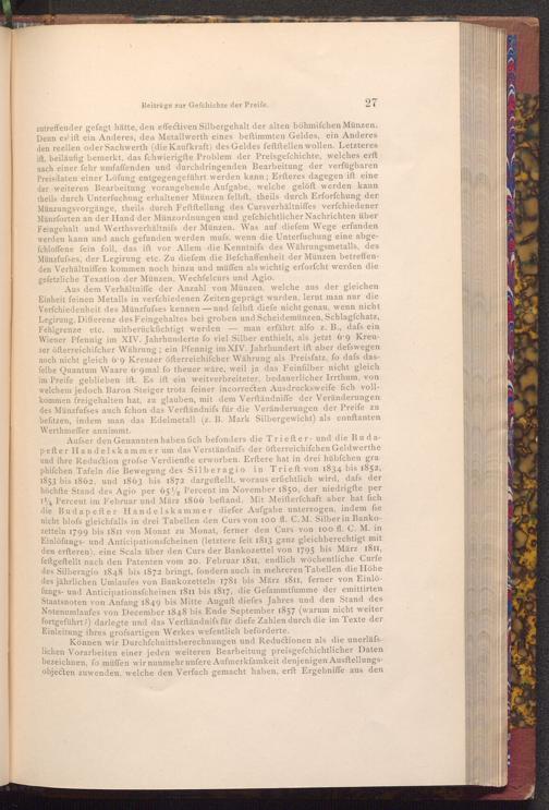 Aus dem Verhältniffe der Anzahl von Münzen, welche aus der gleichen Einheit feinen Metalls in verfchiedenen Zeiten geprägt wurden, lernt man nur die Verfchiedenheit des Münzfufses kennen- und felbft diefe nicht genau, wenn nicht Legirung, Differenz des Feingehaltes bei groben und Scheidemünzen, Schlagfchatz, Fehlgrenze etc. mitberücksichtigt werden man erfährt alfo z. B., dafs ein Wiener Pfennig im XIV. Jahrhunderte fo viel Silber enthielt, als jetzt 6.9 Kreuzer öfterreichifcher Währung; ein Pfennig im XIV. Jahrhundert ift aber defswegen noch nicht gleich 6.9 Kreuzer öfterreichischer Währung als Preisfatz, fo dafs dasfelbe Quantum Waare 6.9mal fo theuer wäre, weil ja das Feinfilber nicht gleich im Preife geblieben ift. Es ift ein weitverbreiteter, bedauerlicher Irrthum, von welchem jedoch Baron Steiger trotz feiner incorrecten Ausdrucksweife fich vollkommen freigehalten hat, zu glauben, mit dem Verftändniffe der Veränderungen des Münzfufses auch fchon das Verſtändnifs für die Veränderungen der Preife zu befitzen, indem man das Edelmetall( z. B. Mark Silbergewicht) als conftanten Werthmeffer annimmt.