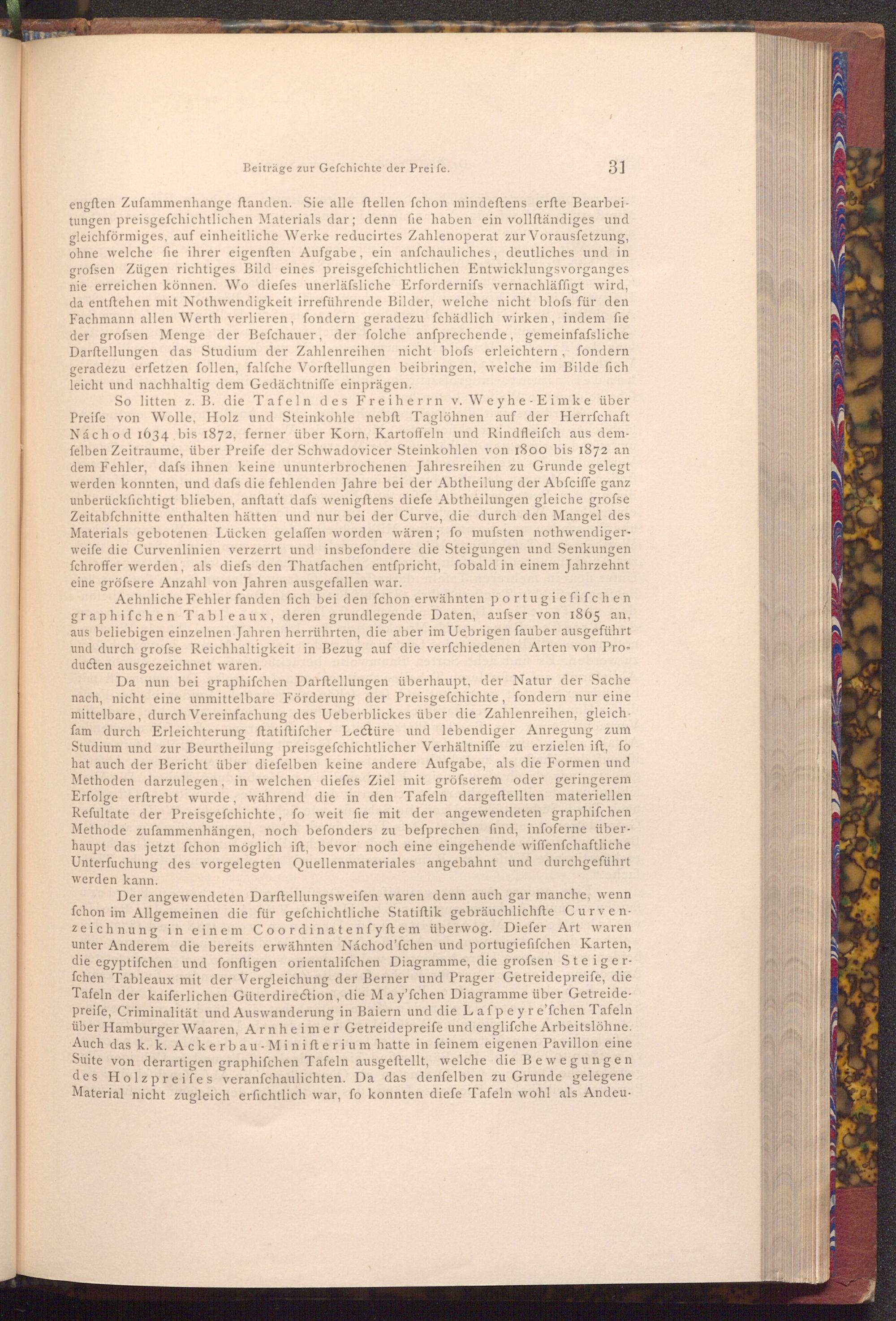 Der angewendeten Darftellungsweifen waren denn auch gar manche, wenn fchon im Allgemeinen die für gefchichtliche Statiſtik gebräuchlichfte Curvenzeichnung in einem Coordinatenfyftem überwog. Diefer Art waren unter Anderem die bereits erwähnten Náchod' fchen und portugiefifchen Karten, die egyptifchen und fonftigen orientalifchen Diagramme, die grofsen Steigerfchen Tableaux mit der Vergleichung der Berner und Prager Getreide preife, die Tafeln der kaiferlichen Güterdirection, die May'fchen Diagramme über Getreidepreife, Criminalität und Auswanderung in Baiern und die Lafpeyre'fchen Tafeln über Hamburger Waaren, Arnheimer Getreidepreife und englifche Arbeitslöhne. Auch das k. k. Ackerbau- Minifterium hatte in feinem eigenen Pavillon eine Suite von derartigen graphifchen Tafeln ausgeftellt, welche die Bewegungen des Holzpreifes veranfchaulichten. Da das denfelben zu Grunde gelegene Material nicht zugleich erfichtlich war, fo konnten diefe Tafeln wohl als Andeu