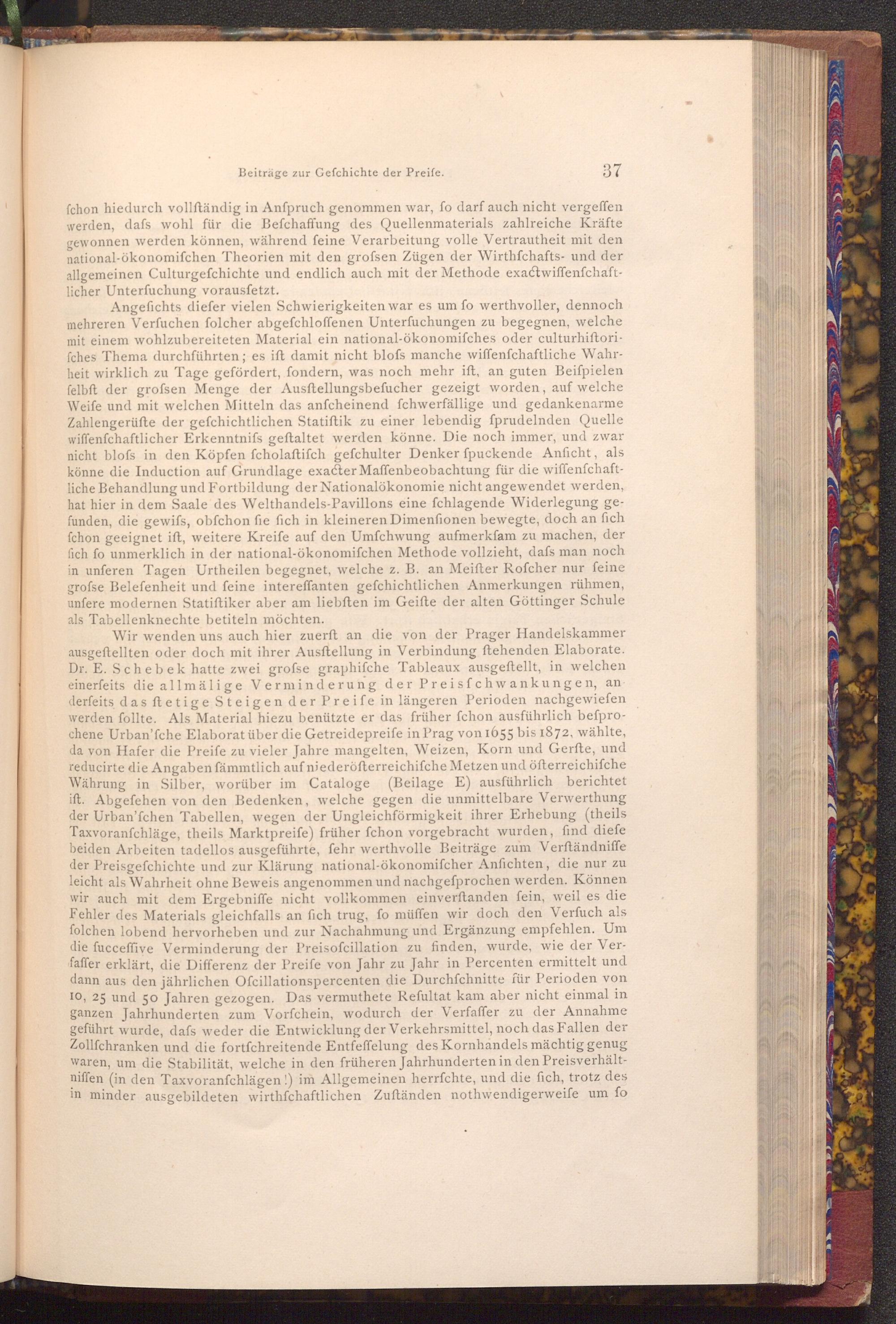 Wir wenden uns auch hier zuerft an die von der Prager Handelskammer ausgeftellten oder doch mit ihrer Ausftellung in Verbindung ftehenden Elaborate. Dr. E. Schebek hatte zwei grofse graphifche Tableaux ausgeftellt, in welchen einerfeits die allmälige Verminderung der Preisfchwankungen, an derfeits das ftetige Steigen der Preife in längeren Perioden nachgewiefen werden follte. Als Material hiezu benützte er das früher fchon ausführlich befprochene Urban'fche Elaborat über die Getreidepreife in Prag von 1655 bis 1872, wählte, da von Hafer die Preife zu vieler Jahre mangelten, Weizen, Korn und Gerfte, und reducirte die Angaben fämmtlich auf niederöfterreichifche Metzen und öfterreichifche Währung in Silber, worüber im Cataloge( Beilage E) ausführlich berichtet ift. Abgefehen von den Bedenken, welche gegen die unmittelbare Verwerthung der Urban'fchen Tabellen, wegen der Ungleichförmigkeit ihrer Erhebung( theils Taxvoranfchläge, theils Marktpreife) früher fchon vorgebracht wurden, find diefe beiden Arbeiten tadellos ausgeführte, fehr werthvolle Beiträge zum Verftändniffe der Preisgefchichte und zur Klärung national- ökonomifcher Anfichten, die nur zu leicht als Wahrheit ohne Beweis angenommen und nachgefprochen werden. Können wir auch mit dem Ergebniffe nicht vollkommen einverftanden fein, weil es die Fehler des Materials gleichfalls an fich trug, fo müffen wir doch den Verfuch als folchen lobend hervorheben und zur Nachahmung und Ergänzung empfehlen. Um die fucceffive Verminderung der Preisofcillation zu finden, wurde, wie der Verfaffer erklärt, die Differenz der Preife von Jahr zu Jahr in Percenten ermittelt und dann aus den jährlichen Ofcillationspercenten die Durchfchnitte für Perioden von 10, 25 und 50 Jahren gezogen. Das vermuthete Refultat kam aber nicht einmal in ganzen Jahrhunderten zum Vorfchein, wodurch der Verfaffer zu der Annahme geführt wurde, dafs weder die Entwicklung der Verkehrsmittel, noch das Fallen der Zollfchranken und die fortfchreitende Entfeffelung des Kornhandels mächtig genug waren, um die Stabilität, welche in den früheren Jahrhunderten in den Preisverhältniffen( in den Taxvoranfchlägen!) im Allgemeinen herrfchte, und die fich, trotz des in minder ausgebildeten wirthfchaftlichen Zuftänden nothwendigerweife um fo