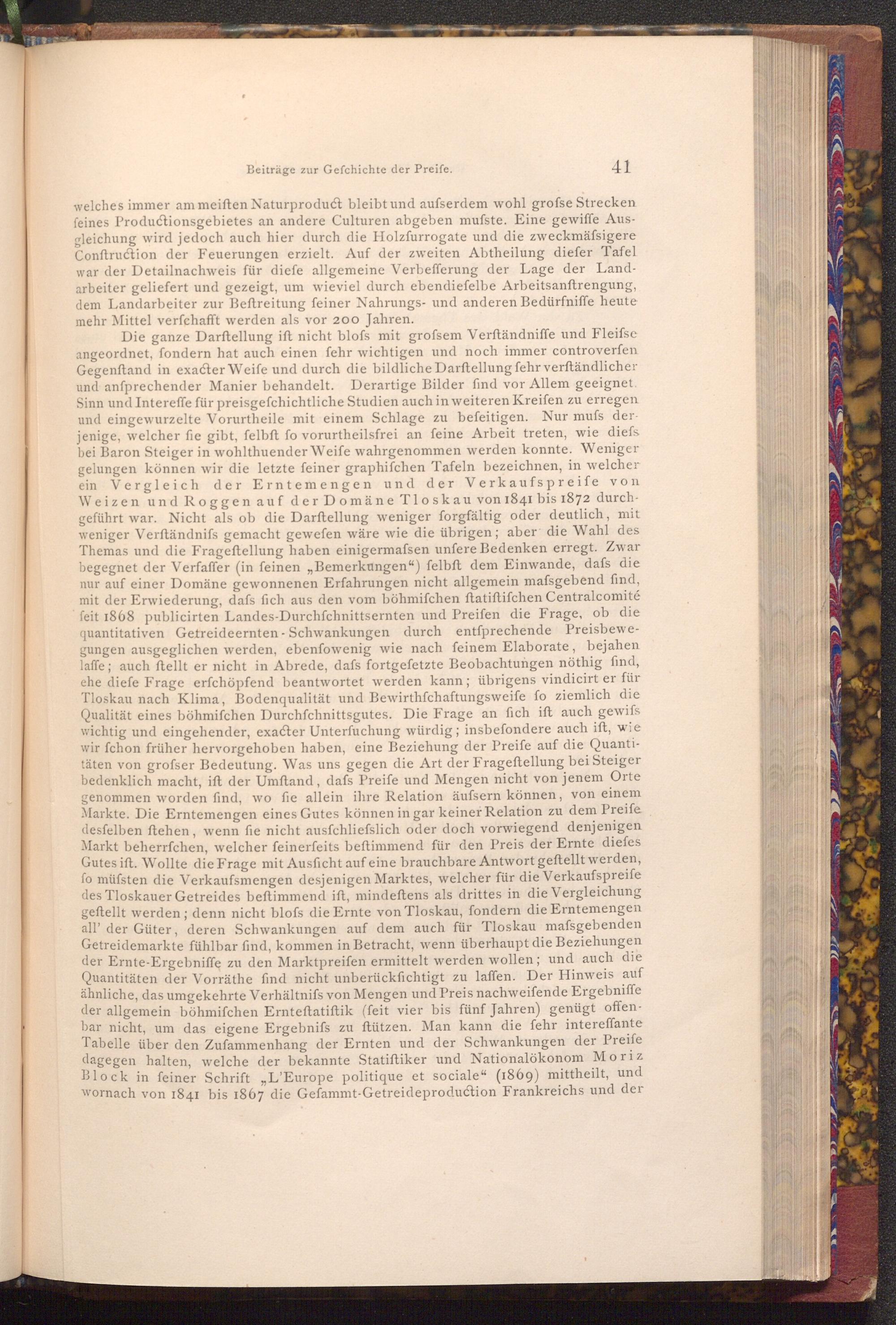 Die ganze Darftellung ist nicht blofs mit grofsem Verſtändniffe und Fleifse angeordnet, fondern hat auch einen fehr wichtigen und noch immer controverfen Gegenftand in exacter Weife und durch die bildliche Darftellung fehr verftändlicher und anfprechender Manier behandelt. Derartige Bilder find vor Allem geeignet. Sinn und Intereffe für preisgefchichtliche Studien auch in weiteren Kreifen zu erregen und eingewurzelte Vorurtheile mit einem Schlage zu befeitigen. Nur mufs derjenige, welcher fie gibt, felbft fo vorurtheilsfrei an feine Arbeit treten, wie diefs bei Baron Steiger in wohlthuender Weife wahrgenommen werden konnte. Weniger gelungen können wir die letzte feiner graphifchen Tafeln bezeichnen, in welcher ein Vergleich der Ernte mengen und der Verkaufspreise von Weizen und Roggen auf der Domäne Tloskau von 1841 bis 1872 durchgeführt war. Nicht als ob die Darftellung weniger forgfältig oder deutlich, mit weniger Verſtändnifs gemacht gewefen wäre wie die übrigen; aber die Wahl des Themas und die Frageftellung haben einigermassen unfere Bedenken erregt. Zwar begegnet der Verfaffer( in feinen„ Bemerkungen") felbft dem Einwande, dafs die nur auf einer Domäne gewonnenen Erfahrungen nicht allgemein mafsgebend find, mit der Erwiederung, dafs fich aus den vom böhmifchen ftatiftifchen Centralcomité feit 1868 publicirten Landes- Durchfchnittsernten und Preifen die Frage, ob die quantitativen Getreideernten- Schwankungen durch entſprechende Preisbewegungen ausgeglichen werden, ebenfowenig wie nach feinem Elaborate, bejahen laffe; auch ftellt er nicht in Abrede, dafs fortgefetzte Beobachtungen nöthig find, ehe diefe Frage erfchöpfend beantwortet werden kann; übrigens vindicirt er für Tloskau nach Klima, Bodenqualität und Bewirthschaftungsweife fo ziemlich die Qualität eines böhmifchen Durchschnittsgutes. Die Frage an fich ift auch gewiſs wichtig und eingehender, exacter Unterfuchung würdig; insbefondere auch ift, wie wir fchon früher hervorgehoben haben, eine Beziehung der Preife auf die Quantitäten von grofser Bedeutung. Was uns gegen die Art der Frageftellung bei Steiger bedenklich macht, ift der Umftand, dafs Preife und Mengen nicht von jenem Orte genommen worden find, wo fie allein ihre Relation äussern können, von einem Markte. Die Erntemengen eines Gutes können in gar keiner Relation zu dem Preife desfelben ftehen, wenn fie nicht ausfchliefslich oder doch vorwiegend denjenigen Markt beherrfchen, welcher feinerfeits beftimmend für den Preis der Ernte diefes Gutes ift. Wollte die Frage mit Ausficht auf eine brauchbare Antwort geftellt werden, fo müssten die Verkaufsmengen desjenigen Marktes, welcher für die Verkaufspreife des Tloskauer Getreides beftimmend ift, mindeftens als drittes in die Vergleichung geftellt werden; denn nicht blofs die Ernte von Tloskau, fondern die Erntemengen all' der Güter, deren Schwankungen auf dem auch für Tloskau mafsgebenden Getreidemarkte fühlbar find, kommen in Betracht, wenn überhaupt die Beziehungen der Ernte- Ergebniffe zu den Marktpreifen ermittelt werden wollen; und auch die Quantitäten der Vorräthe find nicht unberücksichtigt zu laffen. Der Hinweis auf ähnliche, das umgekehrte Verhältnifs von Mengen und Preis nachweifende Ergebniffe der allgemein böhmifchen Ernteftatiftik( feit vier bis fünf Jahren) genügt offenbar nicht, um das eigene Ergebnifs zu ftützen. Man kann die fehr intereffante Tabelle über den Zufammenhang der Ernten und der Schwankungen der Preife dagegen halten, welche der bekannte Statiſtiker und Nationalökonom Moriz Block in feiner Schrift" L'Europe politique et sociale"( 1869) mittheilt, und wornach von 1841 bis 1867 die Gefammt- Getreideproduction Frankreichs und der