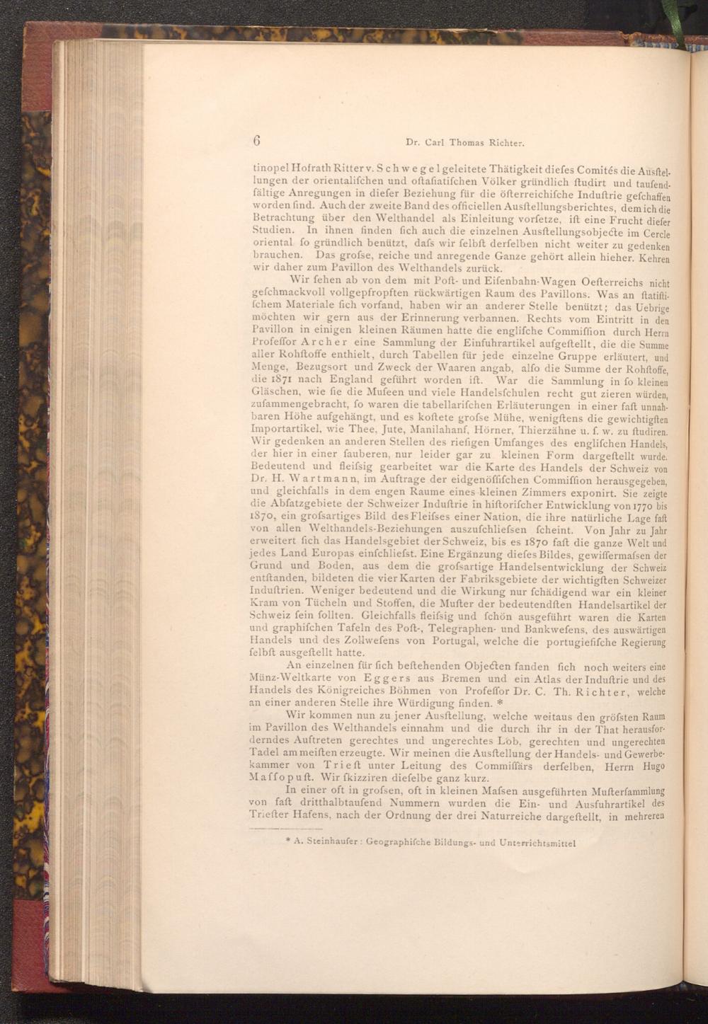 tinopel Hofrath Ritter v. Schwegelgeleitete Thätigkeit diefes Comités die Ausftellungen der orientalifchen und oftafiatifchen Völker gründlich ftudirt und taufendfältige Anregungen in diefer Beziehung für die öfterreichiſche Induſtrie gefchaffen worden find. Auch der zweite Band des officiellen Ausftellungsberichtes, dem ich die Betrachtung über den Welthandel als Einleitung vorfetze, ift eine Frucht diefer Studien. In ihnen finden fich auch die einzelnen Ausftellungsobjecte im Cercle oriental fo gründlich benützt, dafs wir felbft derfelben nicht weiter zu gedenken brauchen. Das grofse, reiche und anregende Ganze gehört allein hieher. Kehren wir daher zum Pavillon des Welthandels zurück.
