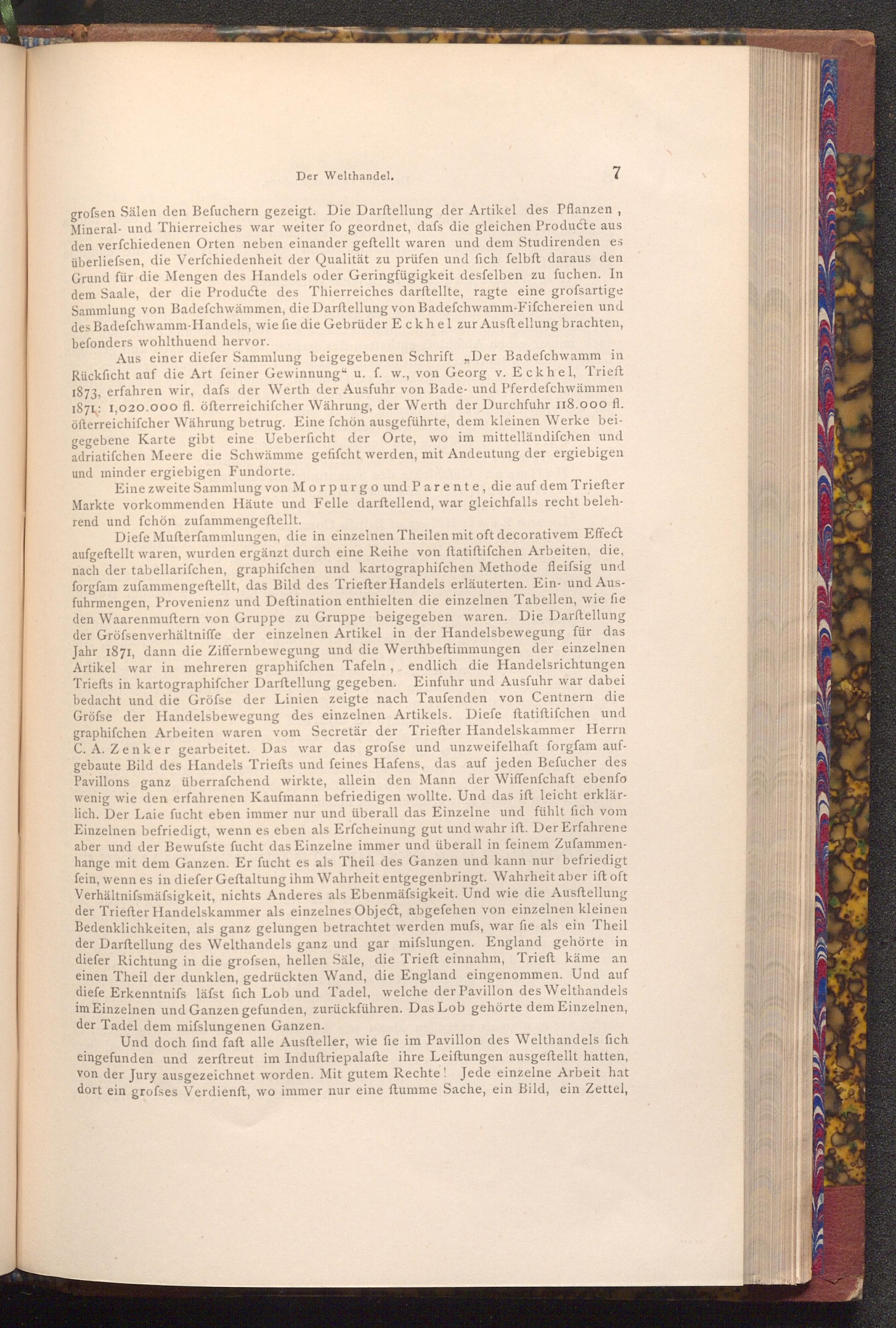 grofsen Sälen den Befuchern gezeigt. Die Darſtellung der Artikel des Pflanzen, Mineral- und Thierreiches war weiter fo geordnet, dafs die gleichen Producte aus den verfchiedenen Orten neben einander geftellt waren und dem Studirenden es überliefsen, die Verfchiedenheit der Qualität zu prüfen und fich felbft daraus den Grund für die Mengen des Handels oder Geringfügigkeit desfelben zu fuchen. In dem Saale, der die Producte des Thierreiches darftellte, ragte eine grossartige Sammlung von Badefchwämmen, die Darftellung von Badefchwamm- Fifchereien und des Badefchwamm- Handels, wie fie die Gebrüder Eckhel zur Ausft ellung brachten, befonders wohlthuend hervor.