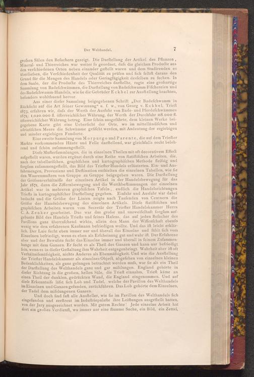 Und doch find faft alle Ausfteller, wie fie im Pavillon des Welthandels fich eingefunden und zerftreut im Induftriepalafte ihre Leiftungen ausgeftellt hatten, von der Jury ausgezeichnet worden. Mit gutem Rechte! Jede einzelne Arbeit hat dort ein grofses Verdienft, wo immer nur eine ftumme Sache, ein Bild, ein Zettel,