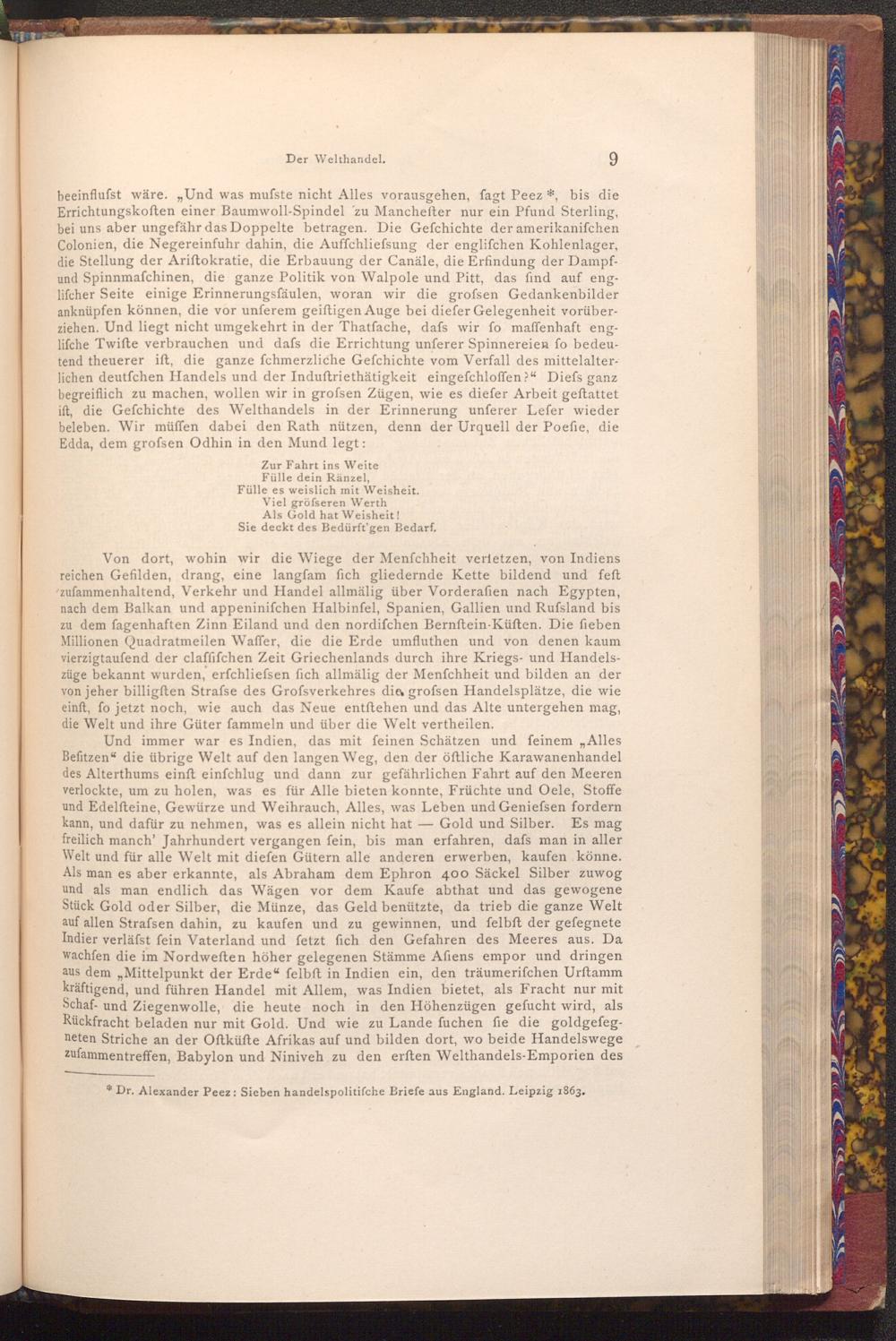 9 beeinflusst wäre." Und was mufste nicht Alles vorausgehen, fagt Peez*, bis die Errichtungskoften einer Baumwoll- Spindel zu Manchefter nur ein Pfund Sterling, bei uns aber ungefähr das Doppelte betragen. Die Gefchichte der amerikaniſchen Colonien, die Negereinfuhr dahin, die Auffchliefsung der englifchen Kohlenlager, die Stellung der Ariftokratie, die Erbauung der Canäle, die Erfindung der Dampfund Spinnmafchinen, die ganze Politik von Walpole und Pitt, das find auf englifcher Seite einige Erinnerungsfäulen, woran wir die grofsen Gedankenbilder anknüpfen können, die vor unferem geiftigen Auge bei diefer Gelegenheit vorüberziehen. Und liegt nicht umgekehrt in der Thatfache, dafs wir fo maffenhaft englifche Twifte verbrauchen und dafs die Errichtung unferer Spinnereien fo bedeutend theuerer ift, die ganze fchmerzliche Gefchichte vom Verfall des mittelalterlichen deutfchen Handels und der Induftriethätigkeit eingefchloffen?" Diefs ganz begreiflich zu machen, wollen wir in grofsen Zügen, wie es diefer Arbeit geftattet ift, die Gefchichte des Welthandels in der Erinnerung unferer Lefer wieder beleben. Wir müffen dabei den Rath nützen, denn der Urquell der Poefie, die Edda, dem grofsen Odhin in den Mund legt: