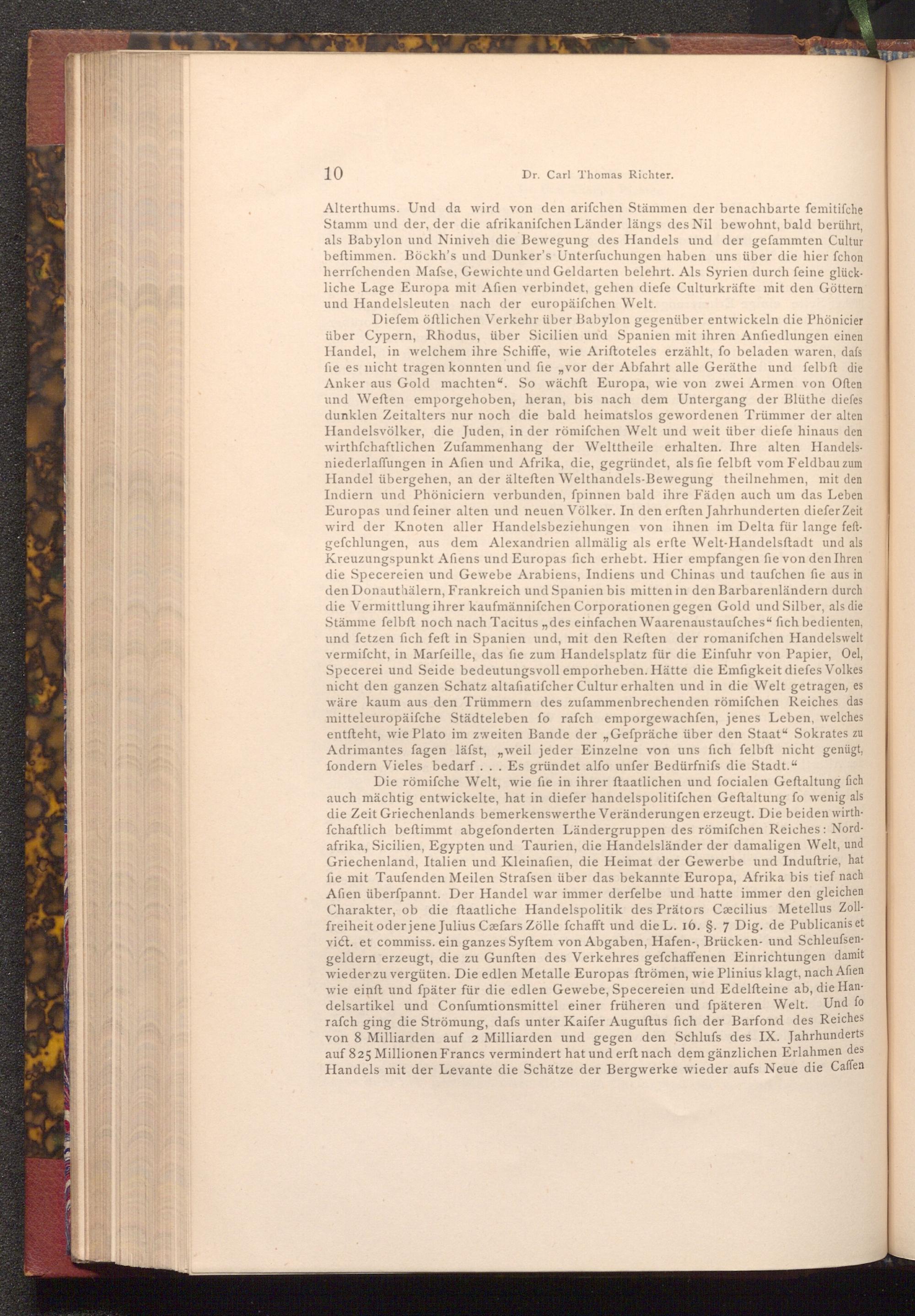 Diefem öftlichen Verkehr über Babylon gegenüber entwickeln die Phönicier über Cypern, Rhodus, über Sicilien und Spanien mit ihren Anfiedlungen einen Handel, in welchem ihre Schiffe, wie Ariftoteles erzählt, fo beladen waren, dafs fie es nicht tragen konnten und fie ,, vor der Abfahrt alle Geräthe und felbft die Anker aus Gold machten". So wächft Europa, wie von zwei Armen von Often und Weften emporgehoben, heran, bis nach dem Untergang der Blüthe diefes dunklen Zeitalters nur noch die bald heimatslos gewordenen Trümmer der alten Handelsvölker, die Juden, in der römifchen Welt und weit über diefe hinaus den wirthschaftlichen Zufammenhang der Welttheile erhalten. Ihre alten Handelsniederlaffungen in Afien und Afrika, die, gegründet, als fie felbft vom Feldbau zum Handel übergehen, an der älteften Welthandels- Bewegung theilnehmen, mit den Indiern und Phöniciern verbunden, fpinnen bald ihre Fäden auch um das Leben Europas und feiner alten und neuen Völker. In den erften Jahrhunderten diefer Zeit wird der Knoten aller Handelsbeziehungen von ihnen im Delta für lange feftgefchlungen, aus dem Alexandrien allmälig als erfte Welt- Handelsftadt und als Kreuzungspunkt Afiens und Europas fich erhebt. Hier empfangen fie von den Ihren die Specereien und Gewebe Arabiens, Indiens und Chinas und taufchen fie aus in den Donauthälern, Frankreich und Spanien bis mitten in den Barbarenländern durch die Vermittlung ihrer kaufmännifchen Corporationen gegen Gold und Silber, als die Stämme felbft noch nach Tacitus ,, des einfachen Waarenaustaufches" fich bedienten, und fetzen fich feft in Spanien und, mit den Reften der romanifchen Handelswelt vermifcht, in Marfeille, das fie zum Handelsplatz für die Einfuhr von Papier, Oel, Specerei und Seide bedeutungsvoll emporheben. Hätte die Emfigkeit diefes Volkes nicht den ganzen Schatz altafiatifcher Cultur erhalten und in die Welt getragen, es wäre kaum aus den Trümmern des zufammenbrechenden römifchen Reiches das mitteleuropäiſche Städteleben fo rafch emporgewachſen, jenes Leben, welches entſteht, wie Plato im zweiten Bande der„ Gefpräche über den Staat" Sokrates zu Adrimantes fagen läfst, weil jeder Einzelne von uns fich felbft nicht genügt, fondern Vieles bedarf... Es gründet alfo unfer Bedürfnifs die Stadt."